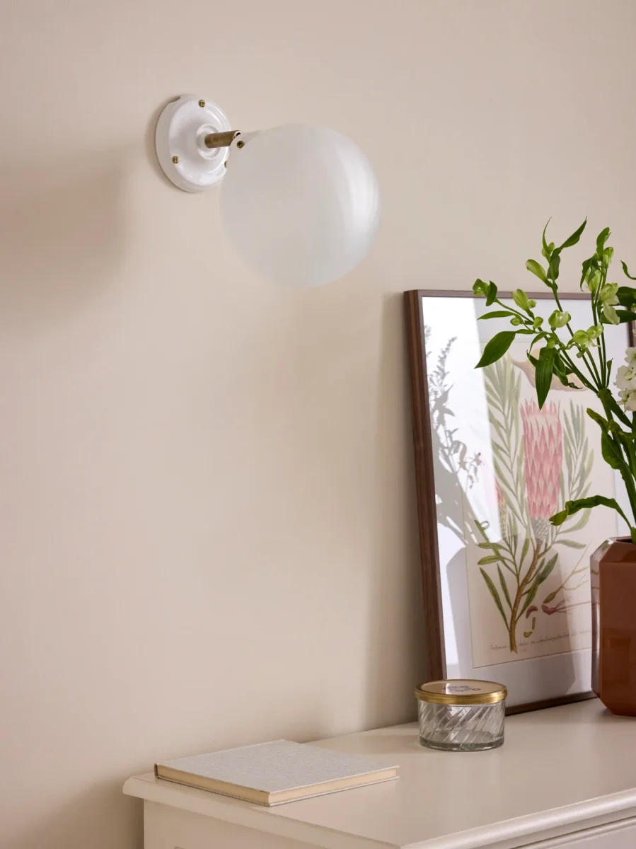 L’applique Zélie mixe modernité et style ancien. Globe en verre dépoli légèrement strié. Socle mouluré en céramique coloris blanc ou noir. Applique orientable fabriquée au Portugal.