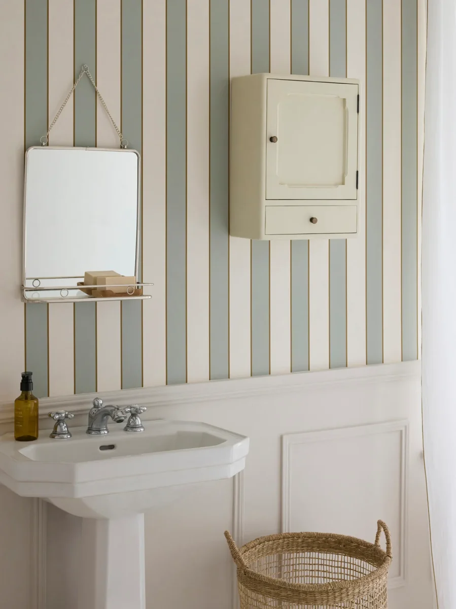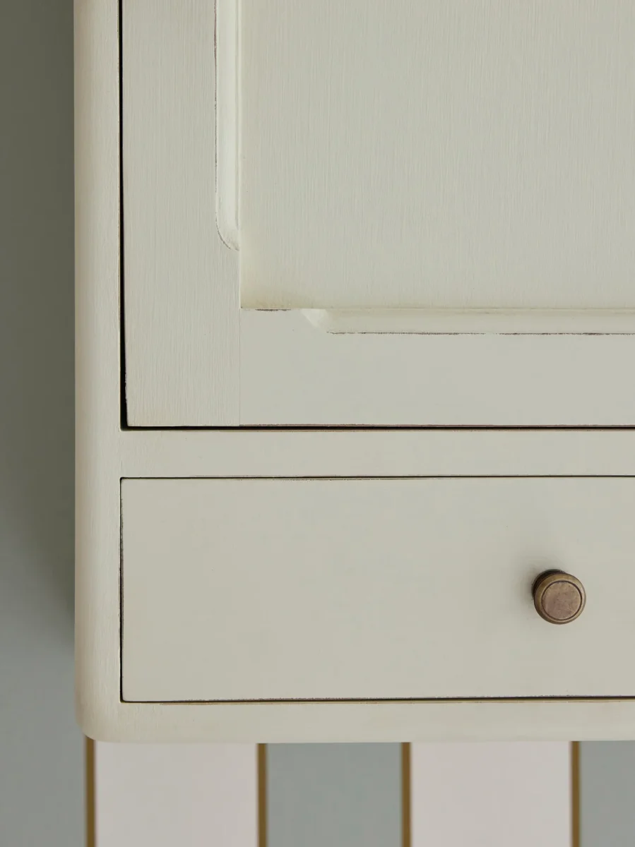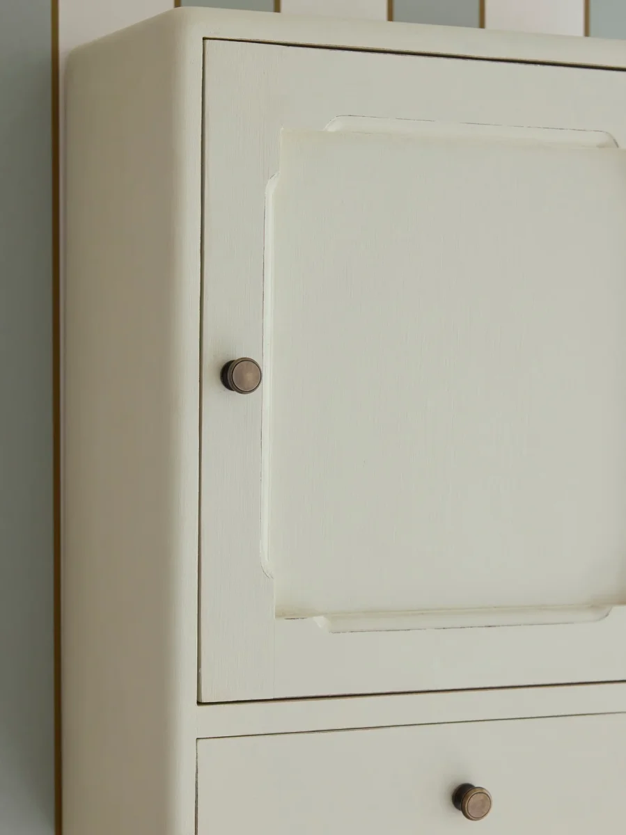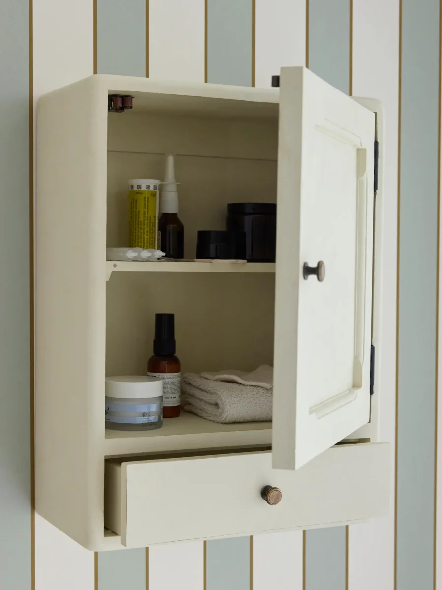 Petite armoire murale en bois peint coloris craie, au design chic et épuré. Elle se compose d’une porte avec une planche étagère intérieure fixe et un tiroir. Meuble fabriqué en Indonésie par des artisans ébénistes et peint à la main avec effet pinceauté.