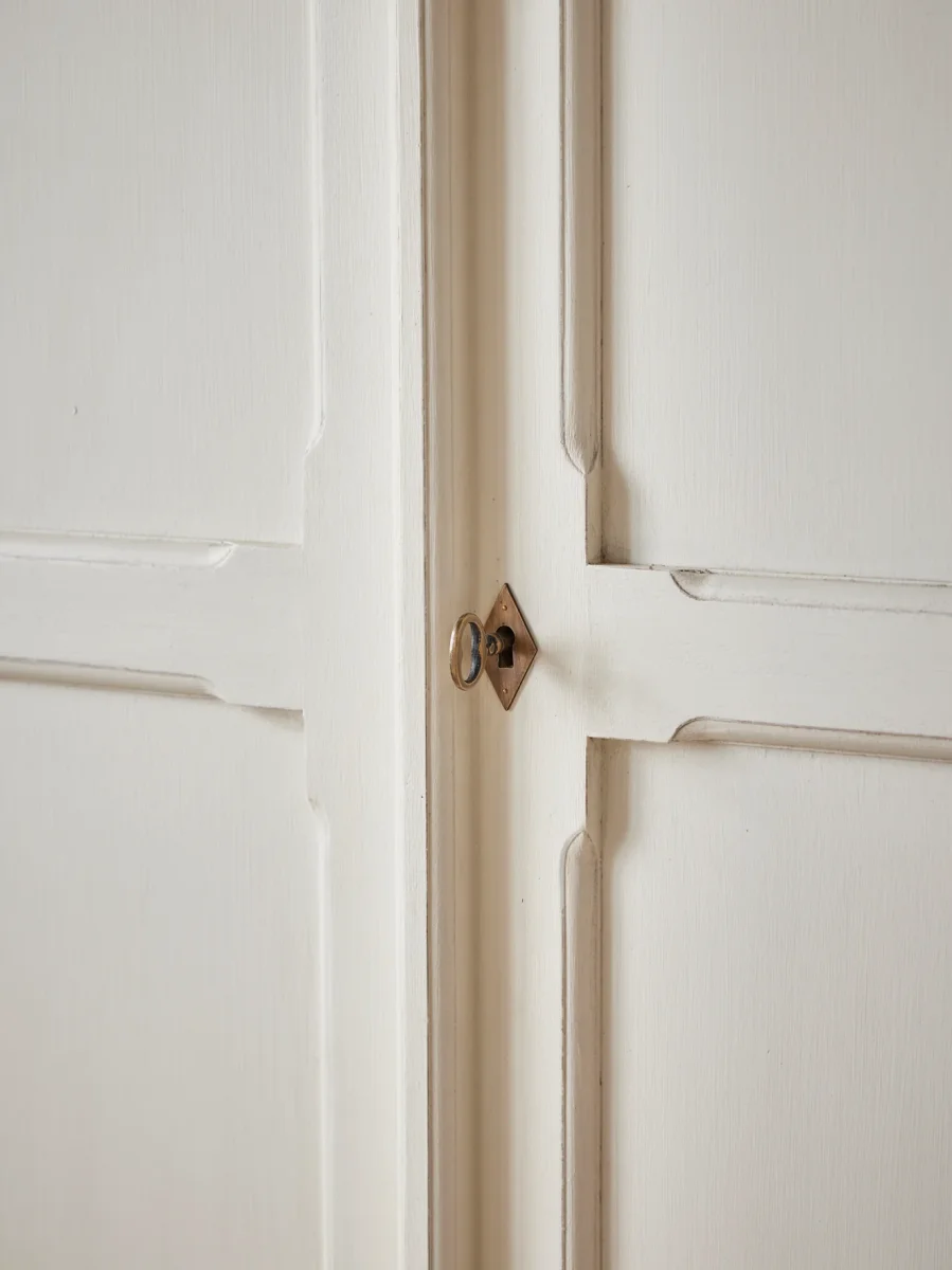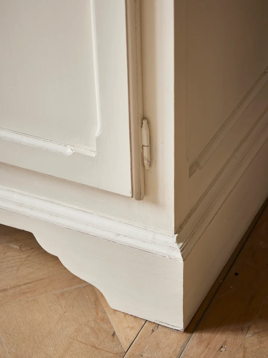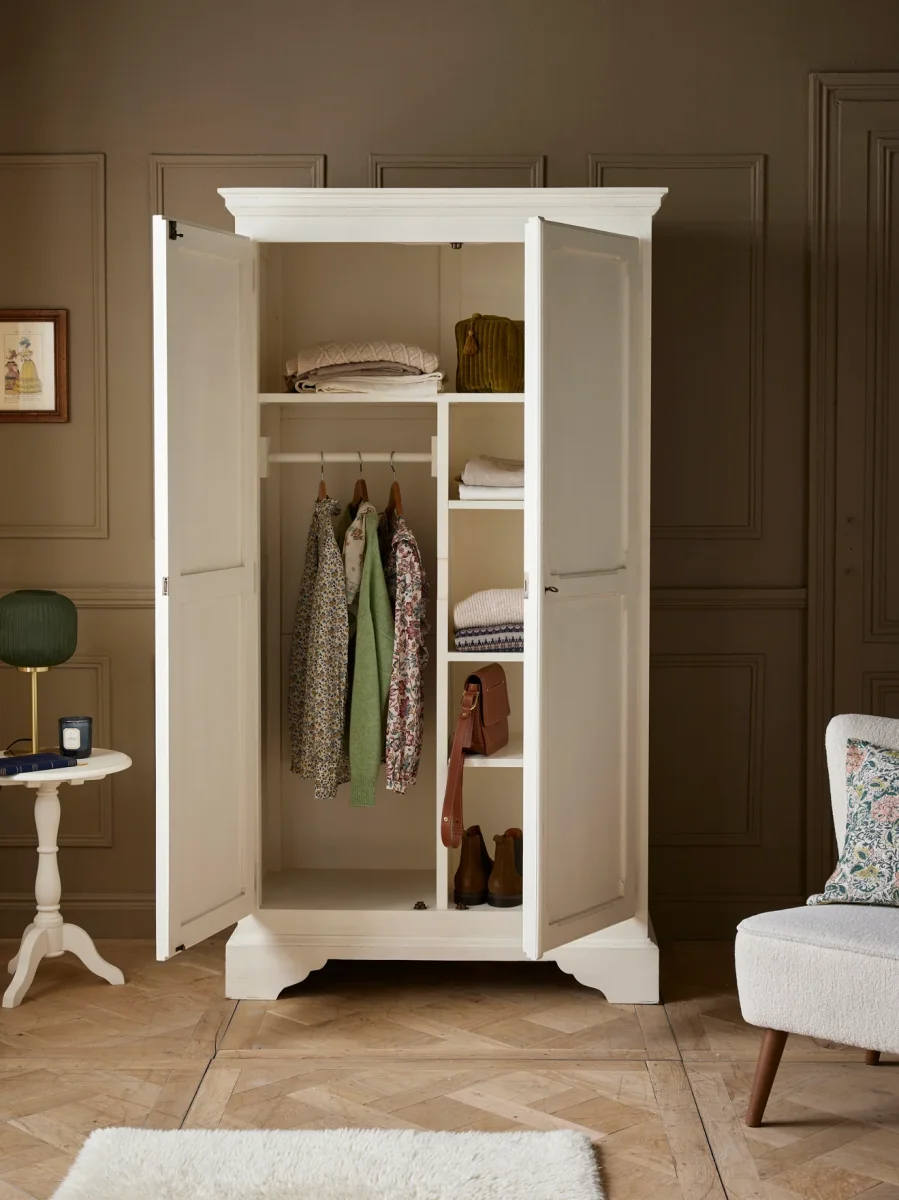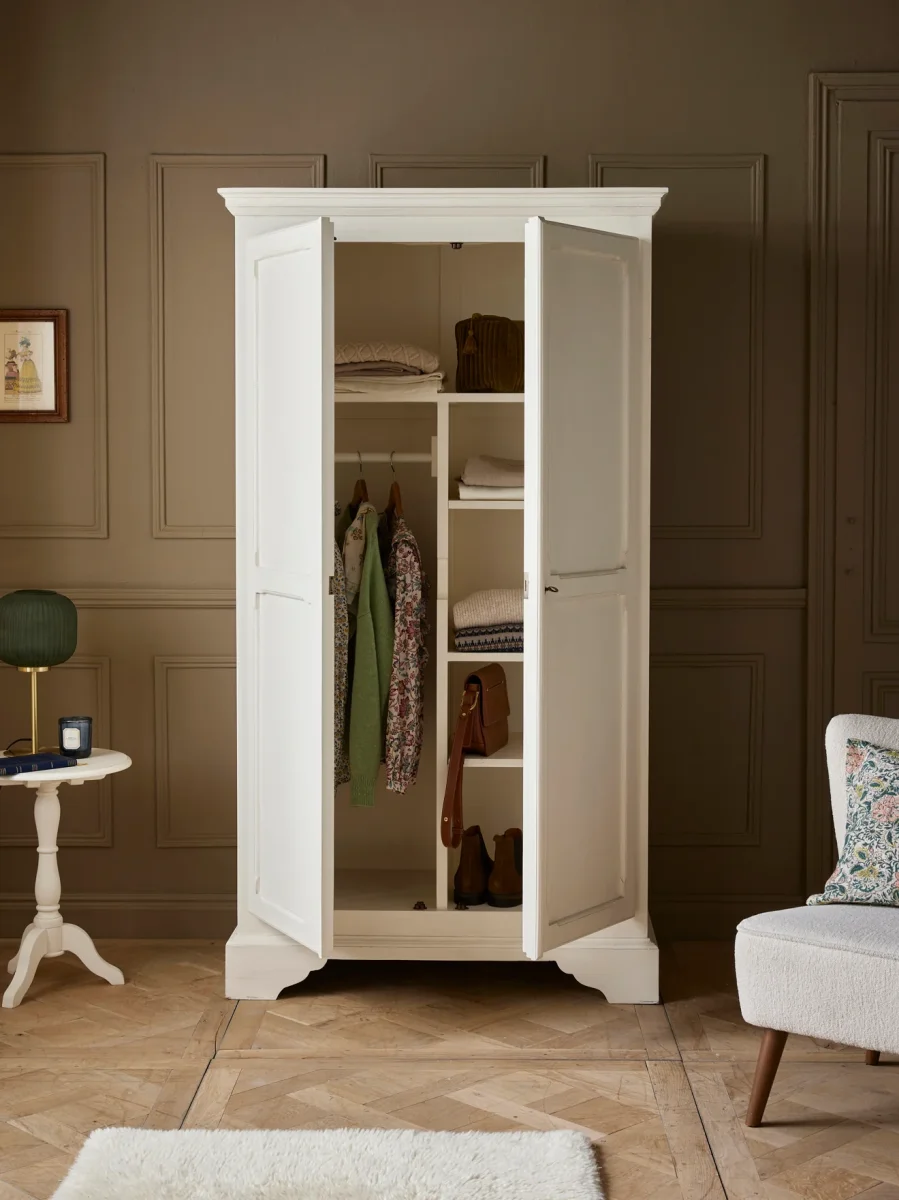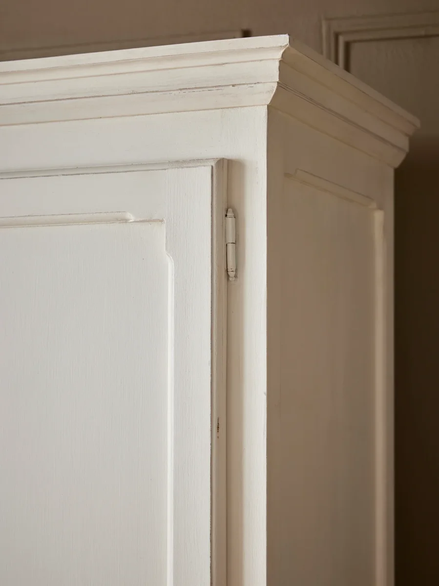 L’armoire double parisienne Margot est l’armoire Héritage par excellence. Raffinée avec ses moulures, son piètement surélevé et sa finition effet « coups de pinceau » réalisée à la main. Elle se compose d’une penderie, d’une grande étagère sur toute la hauteur et de petites planches étagères réglables, et se ferme à clé. Cette armoire en bois peint est fabriquée artisanalement dans des ateliers d’ébénisterie.