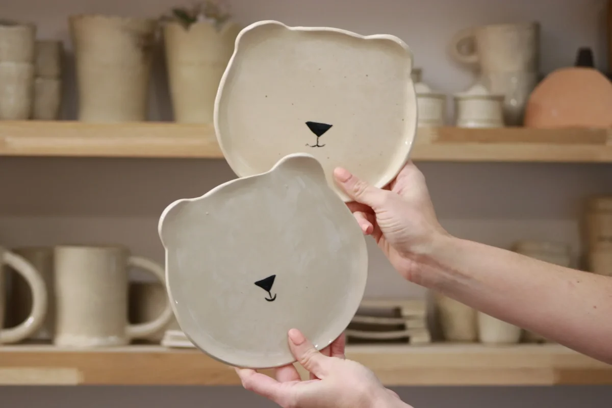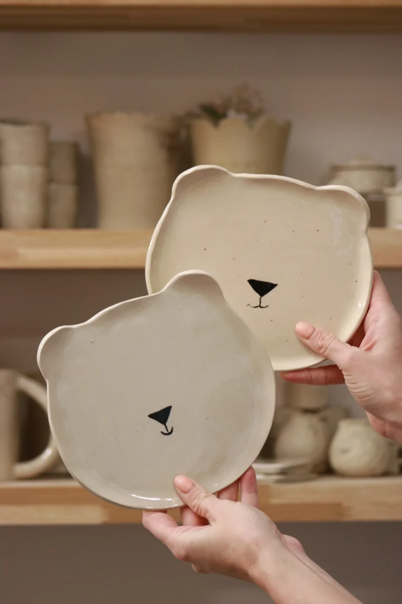 Petite assiette ourson en grès blanc émaillée, peut être légèrement mouchetée. A utiliser pour le repas mais aussi pour décorer une chambre d’enfant.