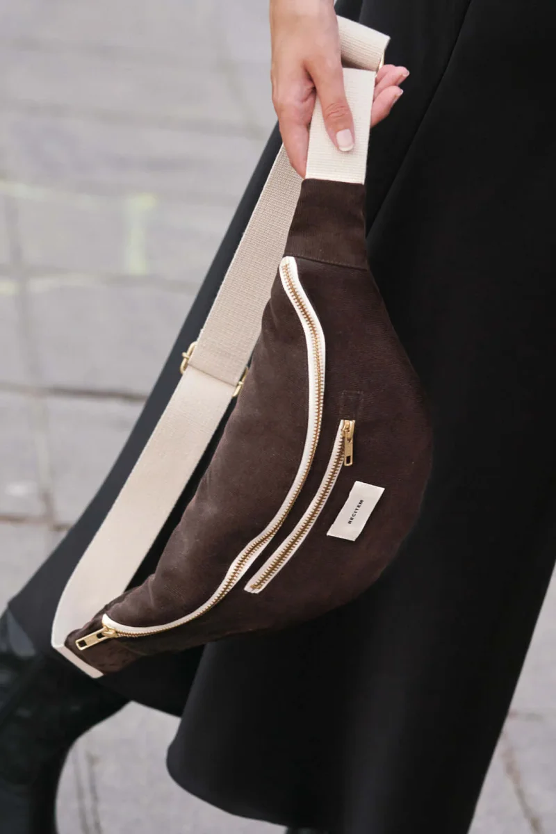 Sac banane velours milleraie : • Marron chocolat qui s’accorde à tous vos looks d’automne. • Sangle réglable qui s’adapte à toutes les morphologies et poche zippée extérieure ultra pratique. • Made in Portugal • Pensée pour durer