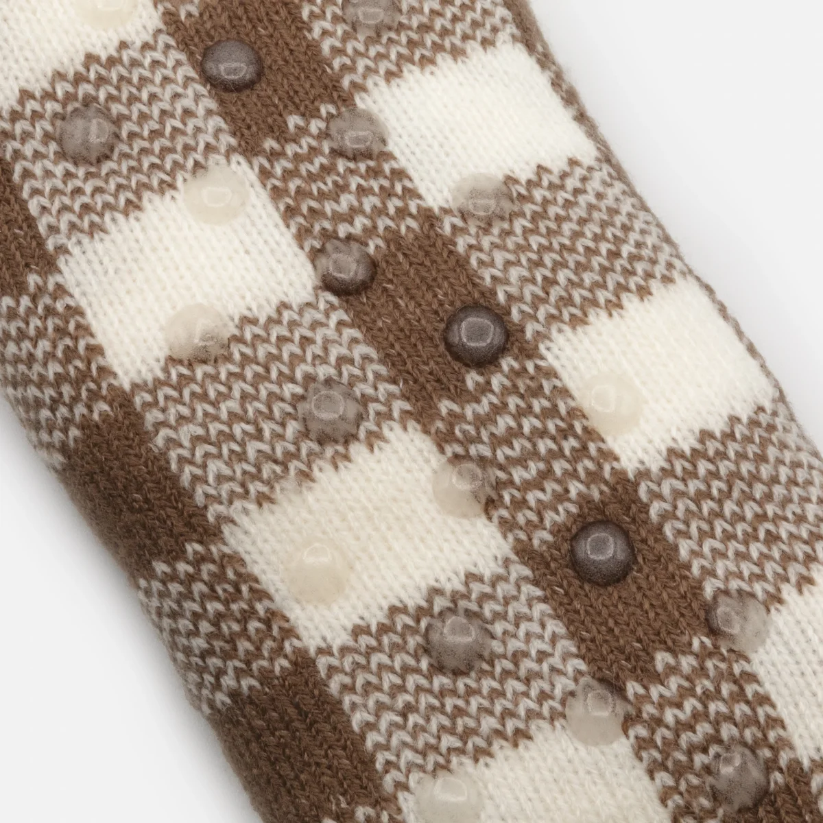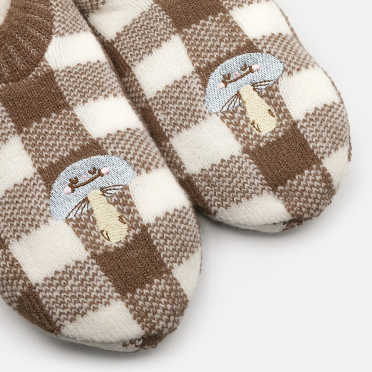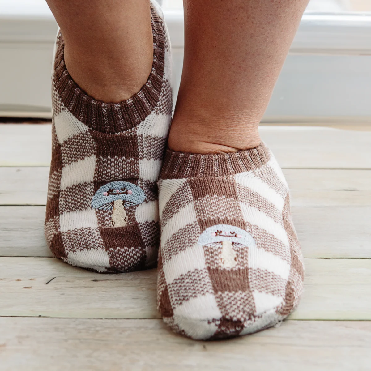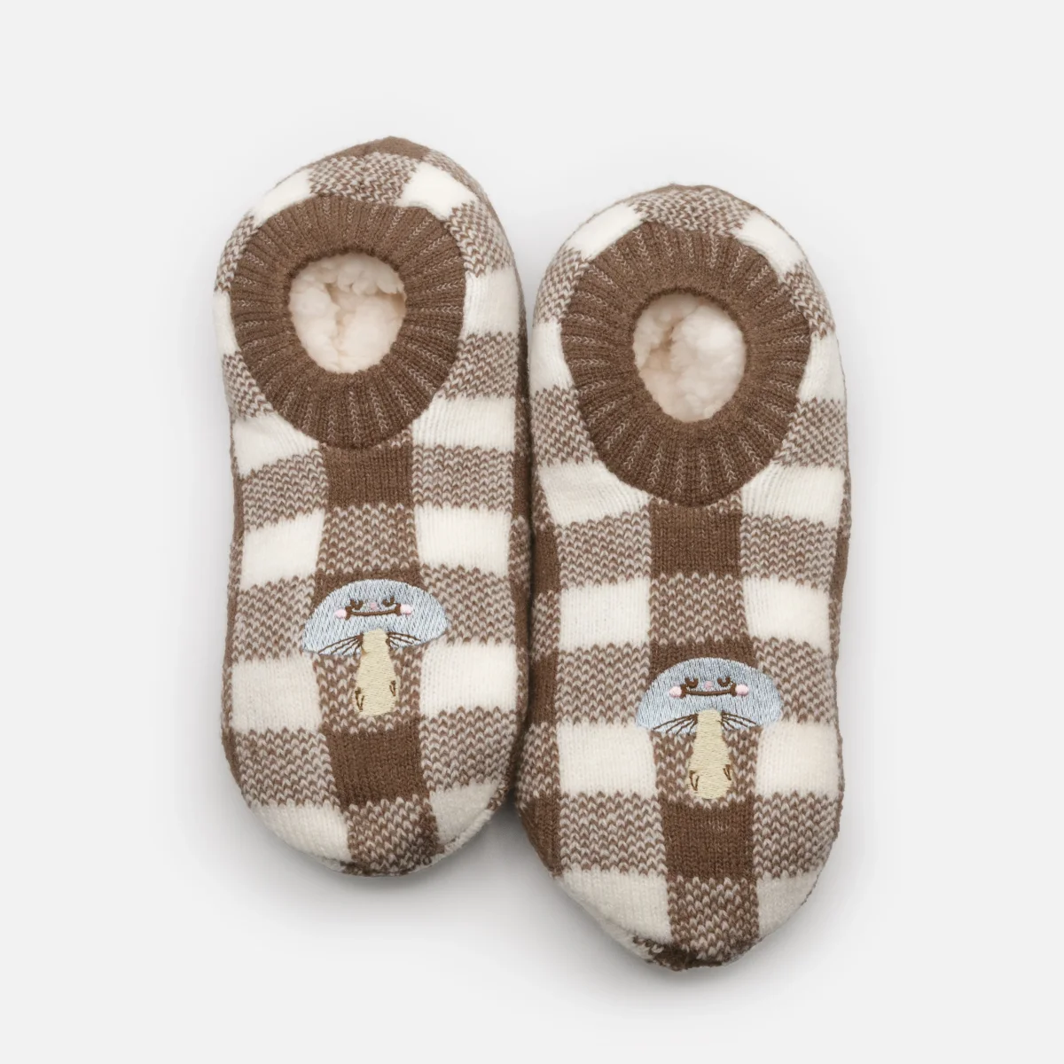 Bas pantoufles à carreaux bruns et blancs avec champignon