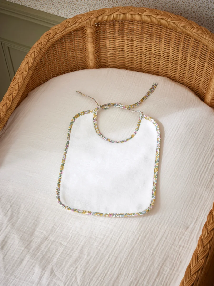 Bavoir en éponge épaisse recto/verso bordé d’un biais en tissu Liberty. Fabriqué au Portugal pour garantir une qualité et une finition remarquables.