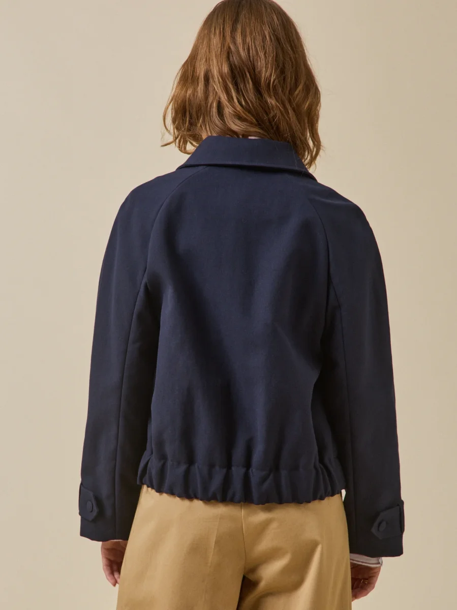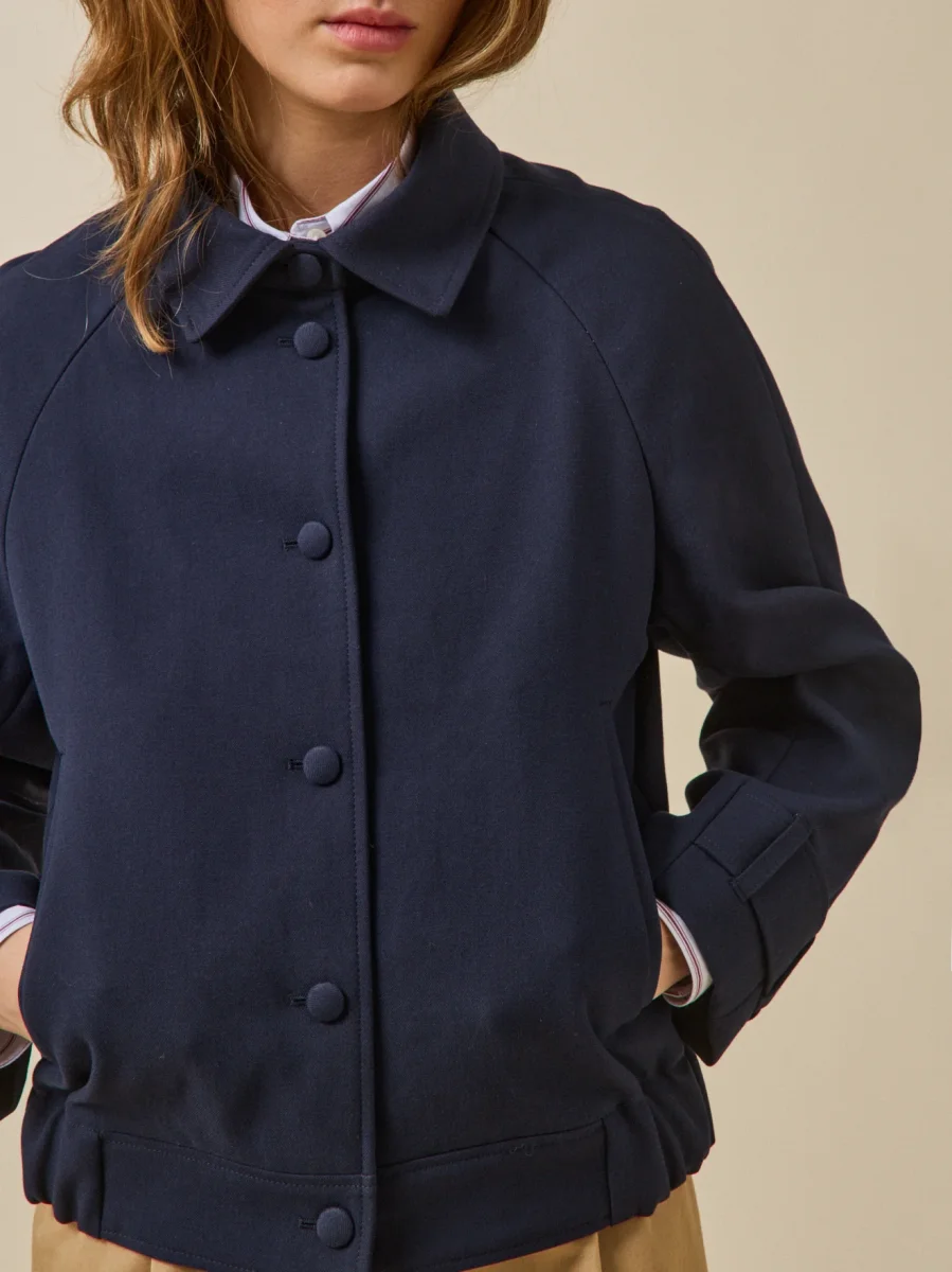 - Col chemise, fermeture boutonnée, 2 poches biais passepoilées, base élastiquée