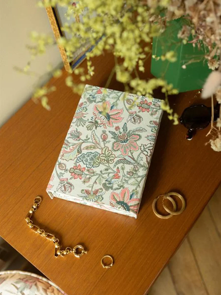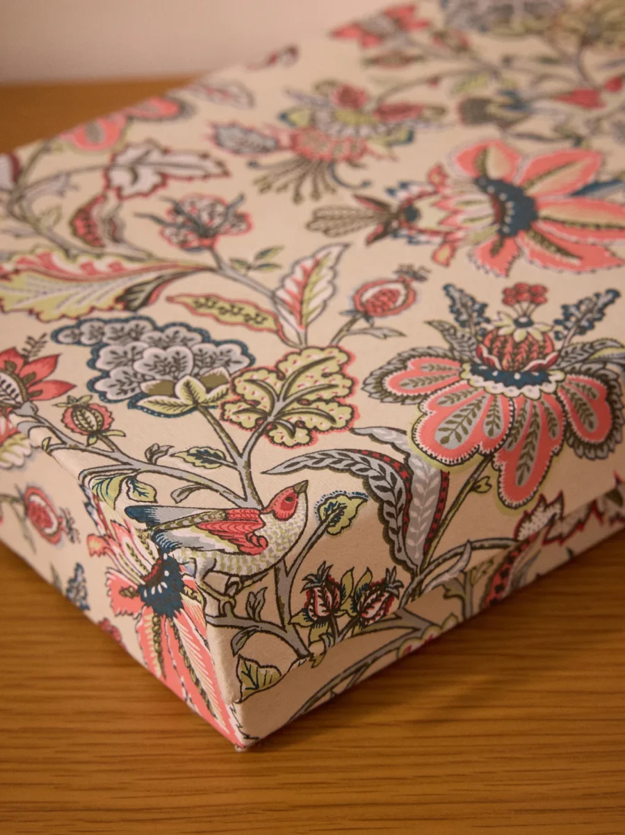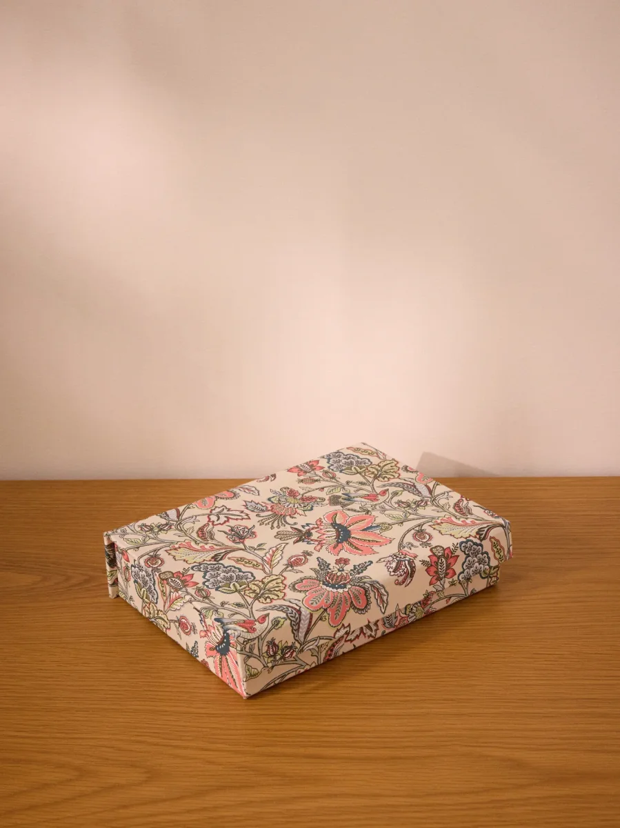 Boîte à bijoux compartimentée avec couvercle rabattable. Boîte en papier cartonné légèrement structuré, imprimé Augustine, fabriquée en Inde de façon artisanale. L’imprimé Augustine est un motif exclusif dessiné par notre équipe de style, il se décline également dans nos collections Linge de lit et Linge de table.