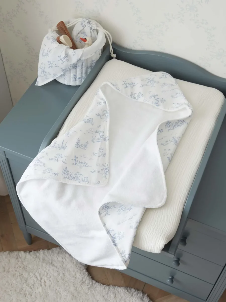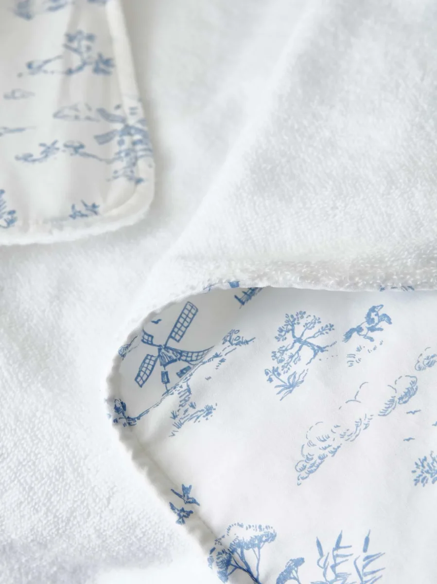 Cape de bain bébé confectionnée au Portugal en percale de coton biologique. Grâce à sa capuche et sa doublure en éponge absorbante, elle est idéale pour envelopper les tout-petits après le bain. Son imprimé élégant et poétique est une réinterprétation enfantine de la célèbre toile de Jouy réalisée par notre styliste.