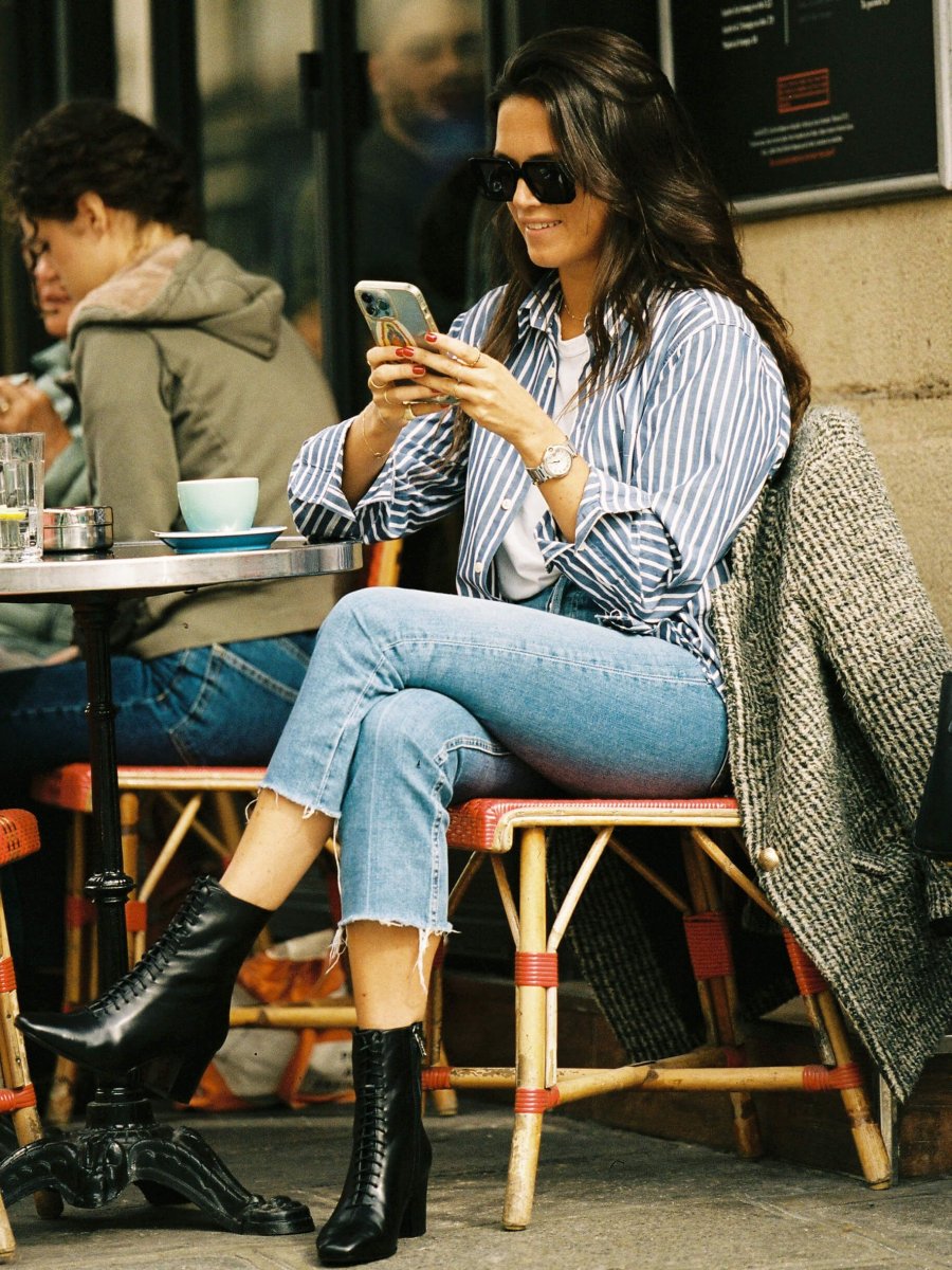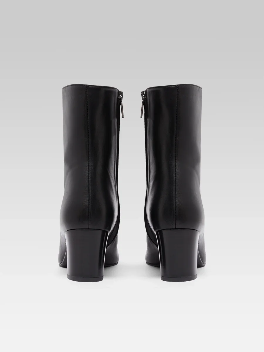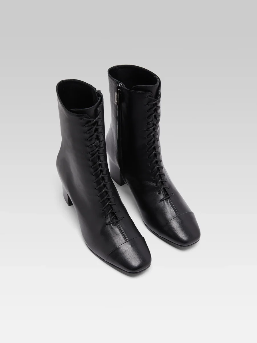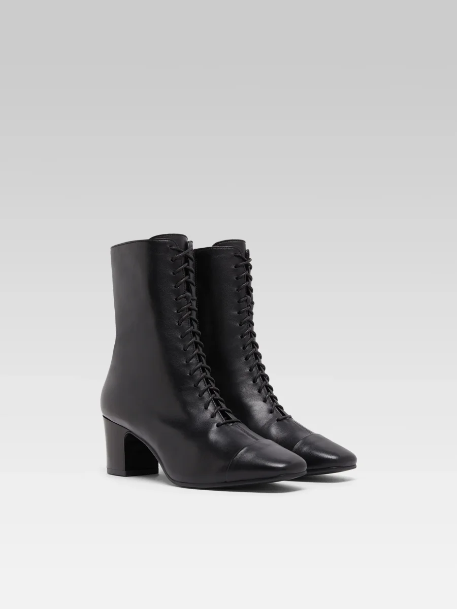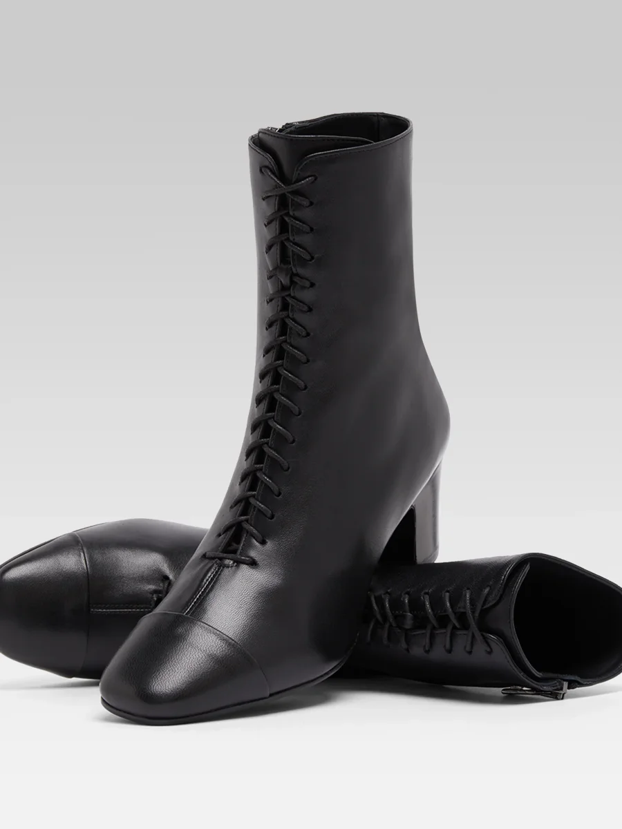 Le modèle Colette est une bottine à tige haute de type « patineuse ». Elle repose sur un talon à gorge de 5 cm et s’agrémente d’un bout droit. Une fermeture intérieure permet d’enfiler la chaussure et les lacets sur la tige permettent de l’adapter facilement à votre cheville.