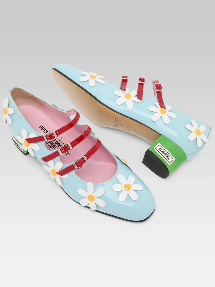 Daisy K – Escarpins babies cuir verni bleu clair et marguerites