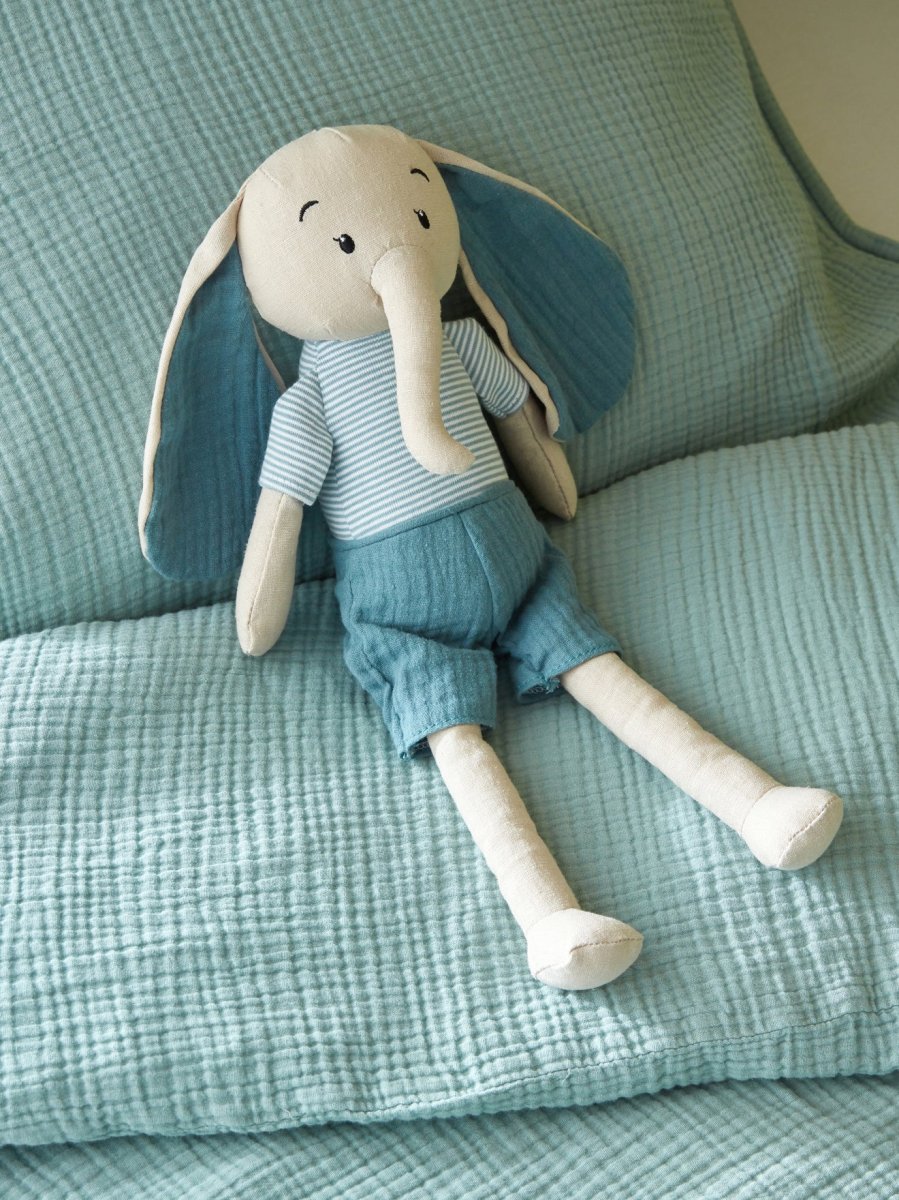 Doudou éléphant en lin et coton avec trompe, grandes oreilles et petits vêtements à croquer. Une peluche en tissu facile à attraper, idéale pour les premiers mois des bébés.