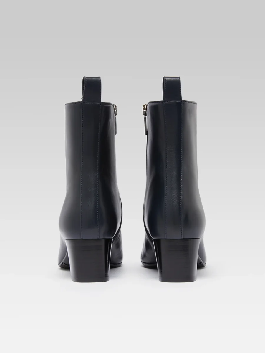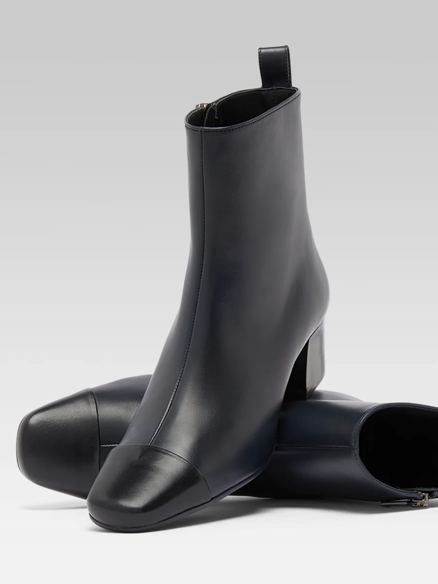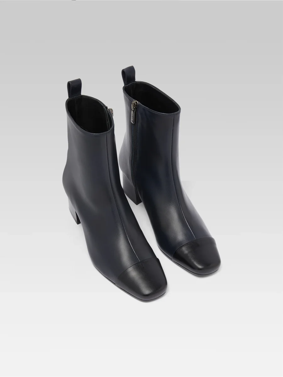 Cette bottine aux inspirations sixties incarne avec son bout droit contrastant, la signature de la maison Carel. Distinguable par son talon trotteur qui apporte confort et stabilité, une bottine aux lignes épurées qui s’adapte à tous les looks.