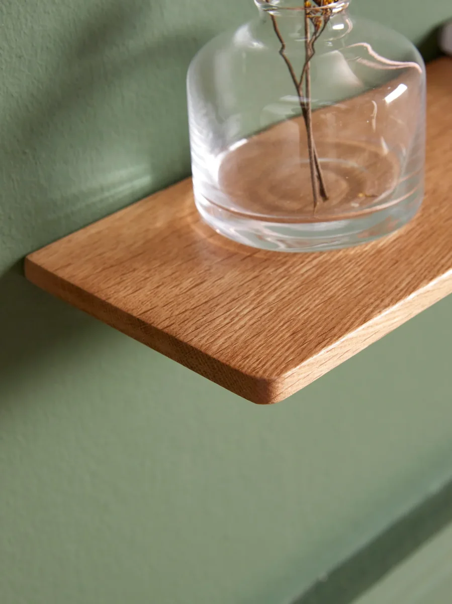 Planche étagère en chêne massif avec finition biseautée et système d’attache invisible. Un style épuré et élancé, idéal pour disposer des petits objets et habiller un mur avec raffinement.