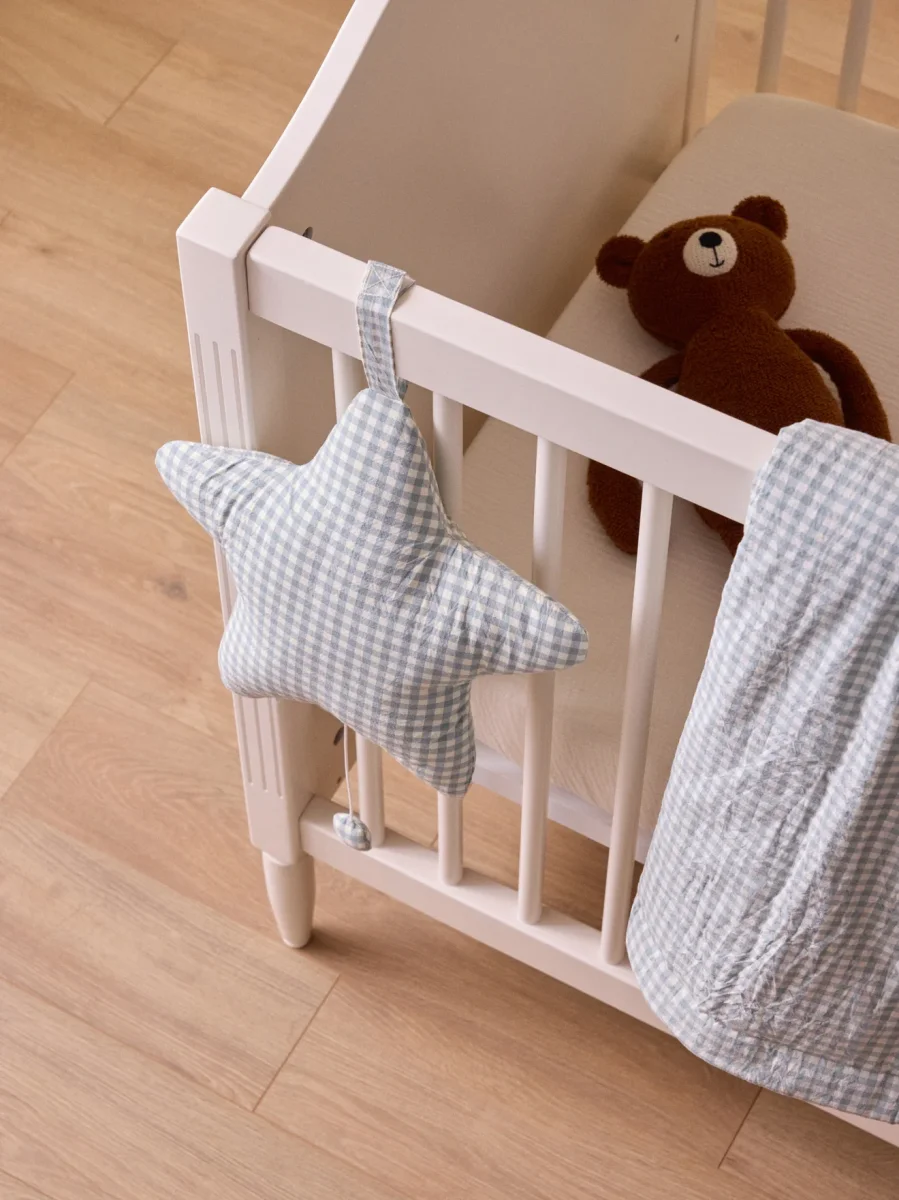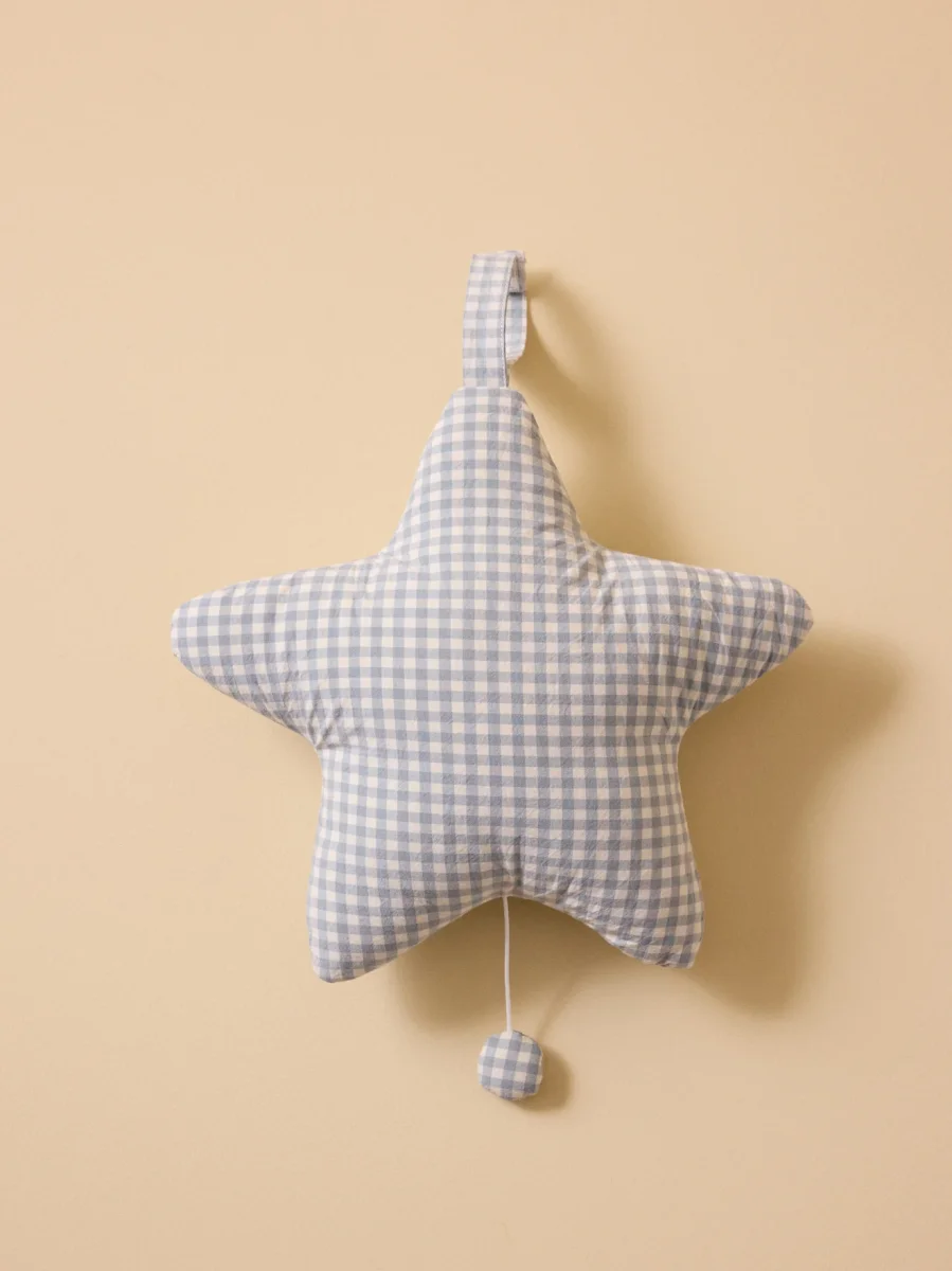 Le coussin musical en gaze de coton imprimée est comme la mélodie qu’il joue : doux, léger et adorable. Une belle idée cadeau.