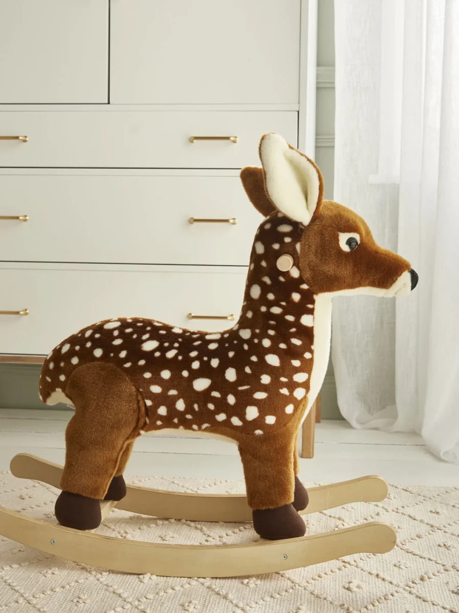 Le traditionnel cheval à bascule se décline dans une version nouvelle. Peluche XXL dotée de poignées et de repose-pieds, le faon à bascule demeure un jouet intemporel pour les petits et une jolie déco dans la chambre.