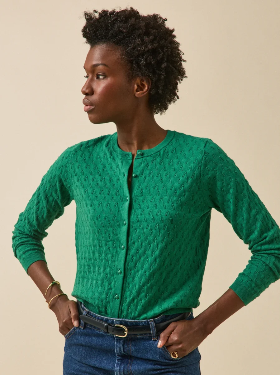 La maille pointelle se réinvente dans une version contemporaine. À porter comme un pull, ce gilet exalte douceur et caractère pour signer une allure féminine d’une grande finesse. Patte de boutonnage, manches longues, finitions bord-côtes ; long. dos 55 cm (en taille S)