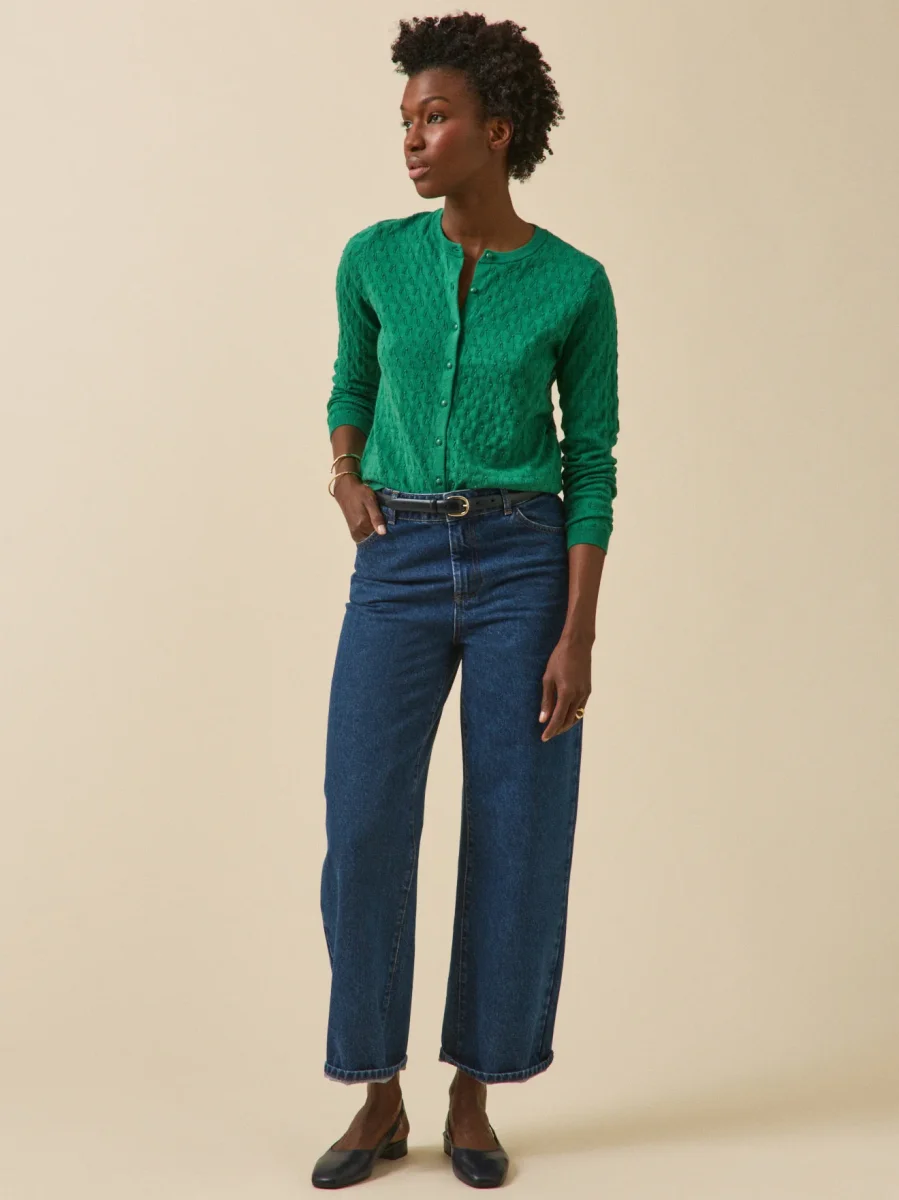 La maille pointelle se réinvente dans une version contemporaine. À porter comme un pull, ce gilet exalte douceur et caractère pour signer une allure féminine d’une grande finesse.