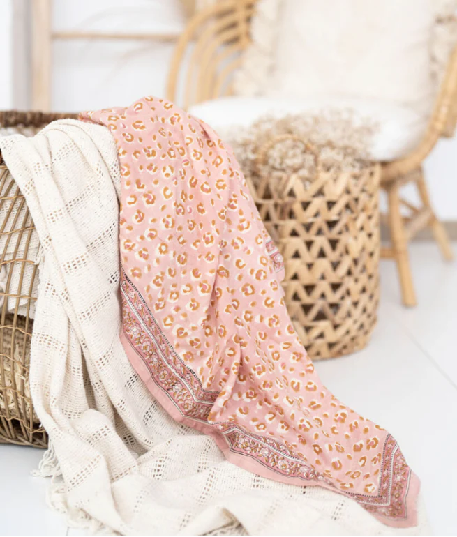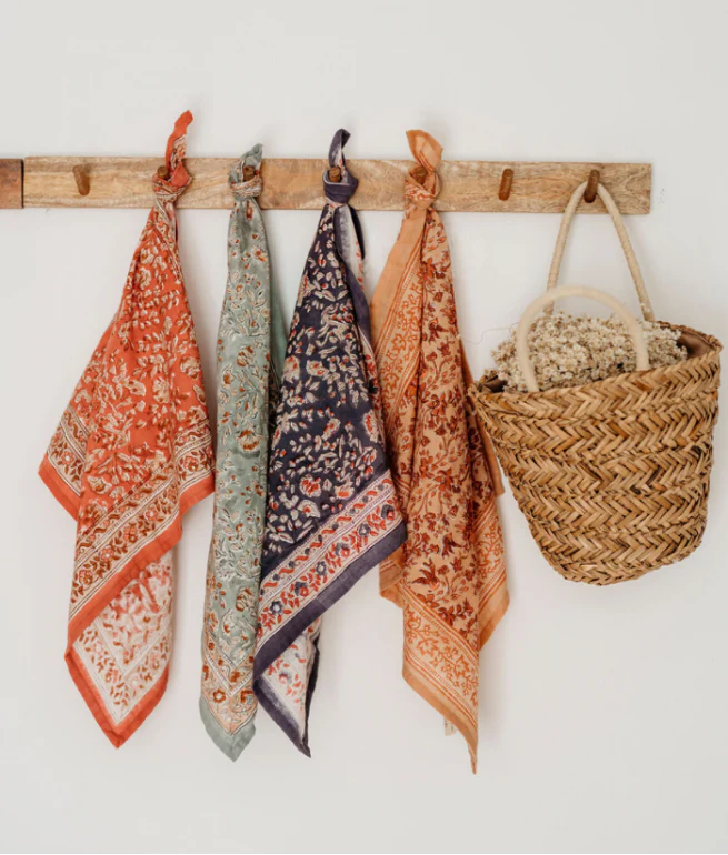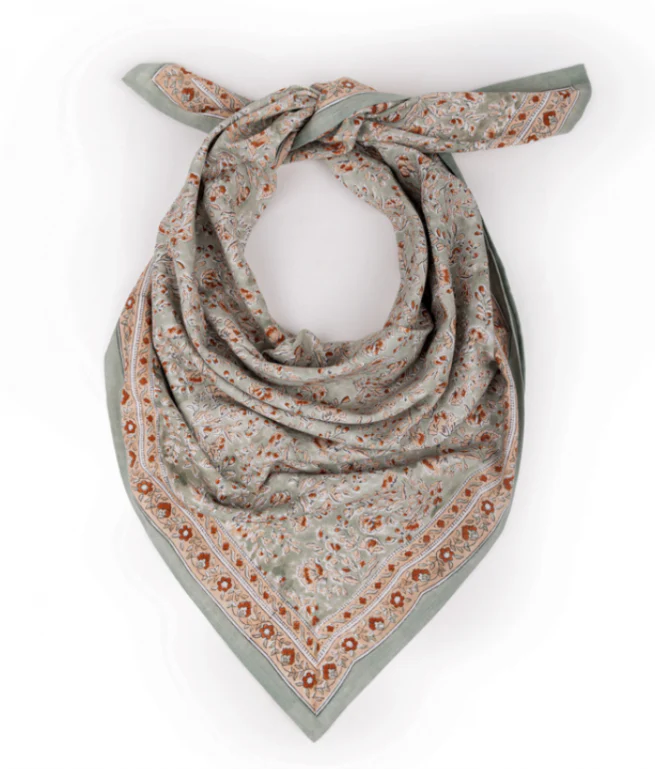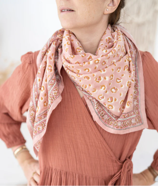 Un carré coloré et imprimé à la main sur un tissu doux et léger, qui enveloppera votre cou pour un petit look boho-chic !À porter autour du cou, dans les cheveux ou en ceinture