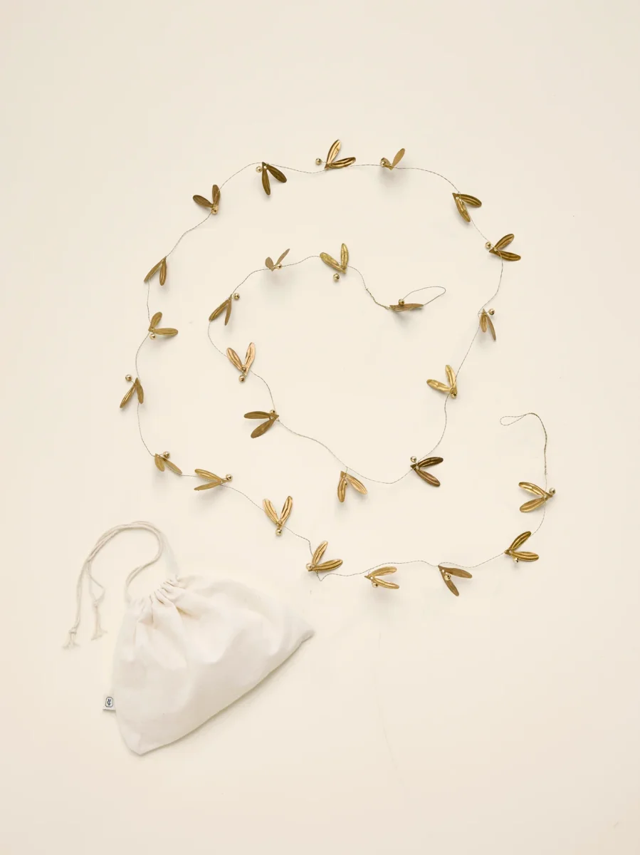 Guirlande composée de feuilles de gui en laiton. À disposer sur le sapin, en centre de table, sur la cheminée… Idéale pour une déco de Noël authentique, élégante et traditionnelle. Guirlande livrée dans un pochon en coton.