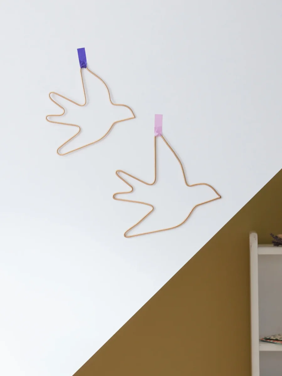2 hirondelles fines et dorées pour habiller avec poésie un mur ou une porte. Création issue de l’artisanat indien.