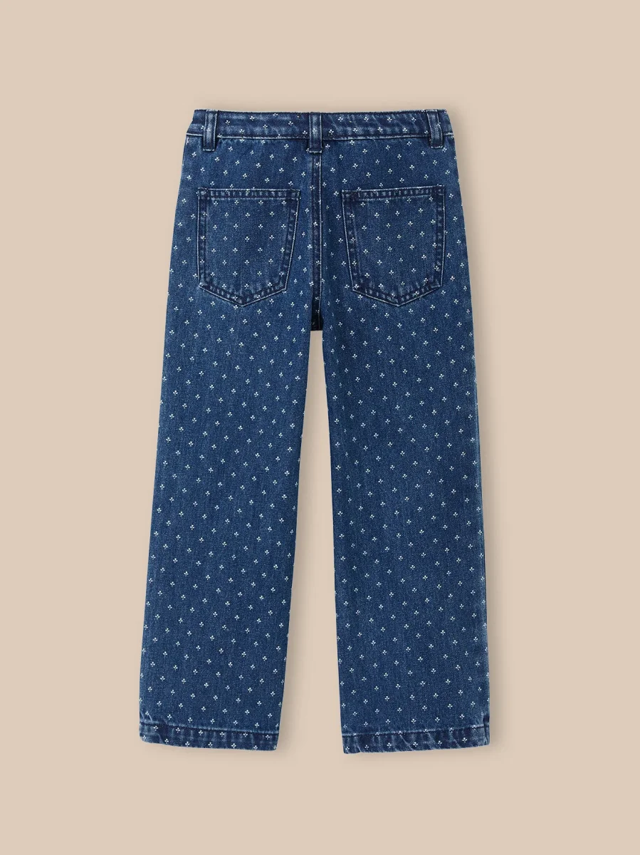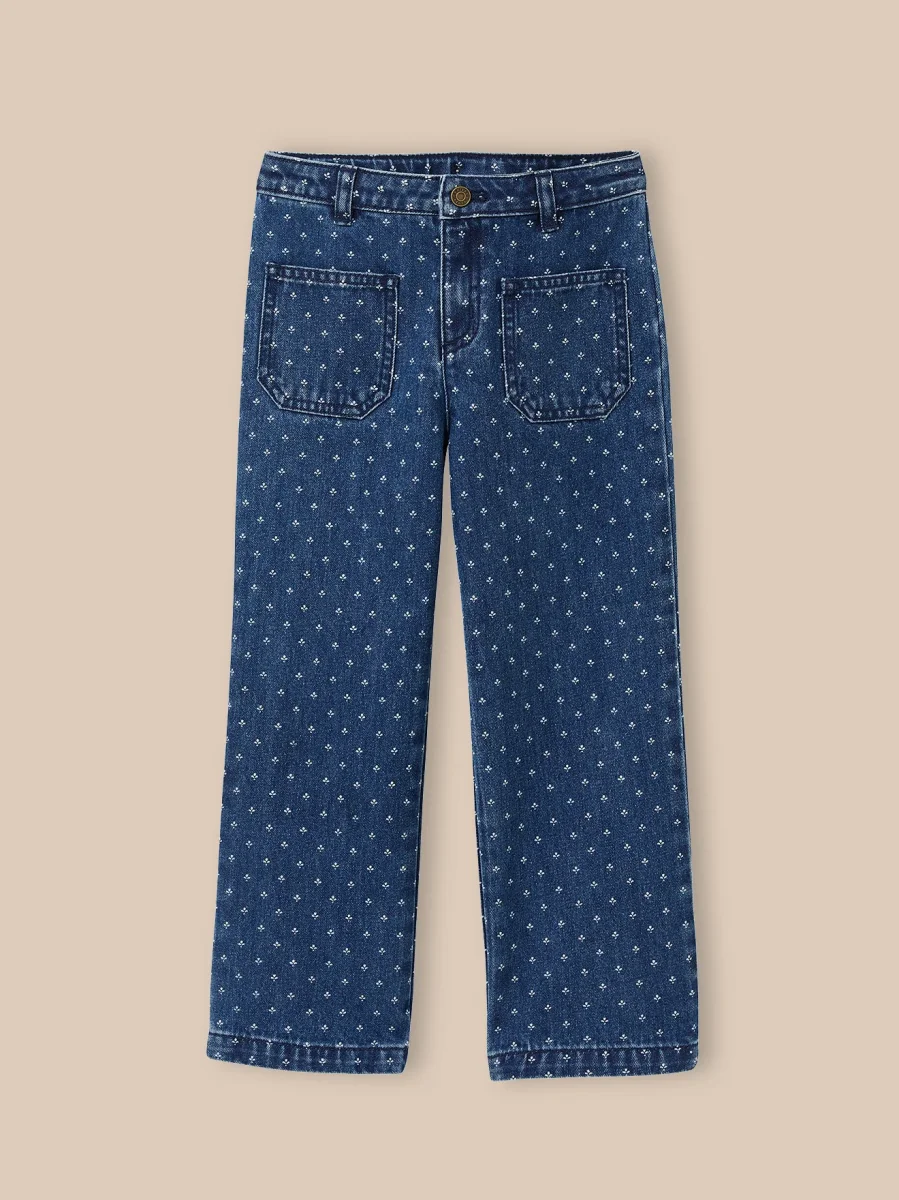 Le jean droit, une coupe essentielle, rehaussée d’un petit motif raffiné.