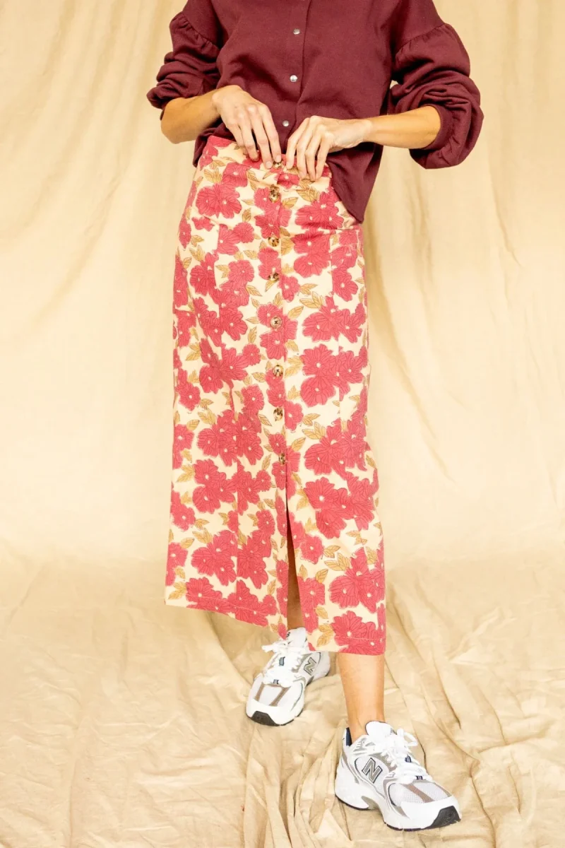 - Jupe longue boutonnée devant, 2 poches plaquées sur le côté