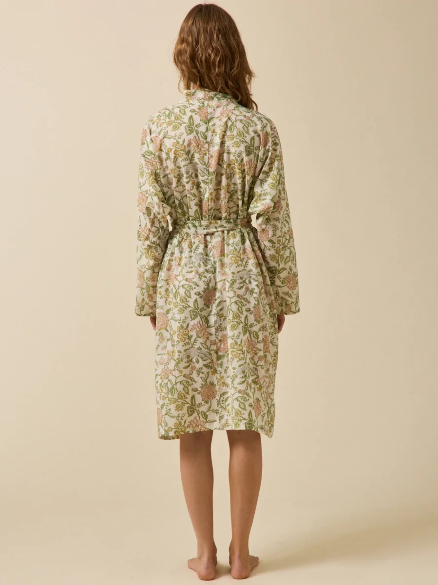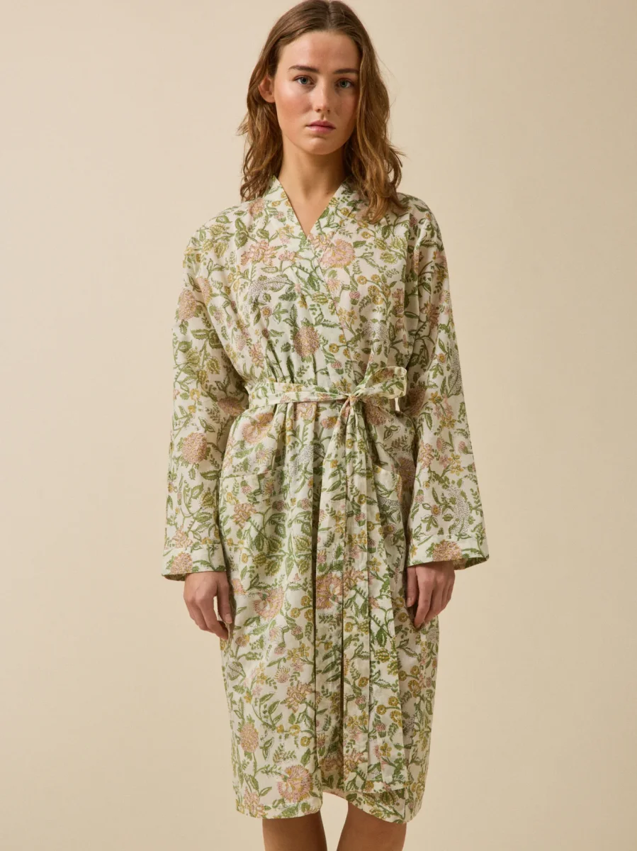 Inspiré des kimonos japonais, ce kimono s’approprie le charme et l’authenticité des motifs indiens imprimés de manière artisanale. Confectionné en voile de coton, il est léger et confortable. L’impression artisanale peut présenter d’éventuelles irrégularités. 2 poches plaquées. Ceinture assortie sous passants. Longueur 107 cm env. Largeur bas de manches 17 cm env.