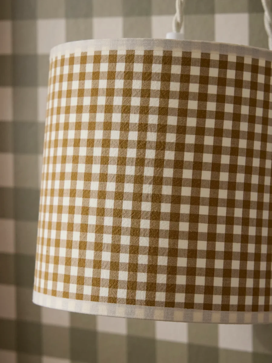 Abat-jour pour lampe baladeuse en coton imprimé Vichy. Baladeuse non électrifiée, fabriquée en France de manière artisanale, disponible en coloris caramel et coloris céladon.