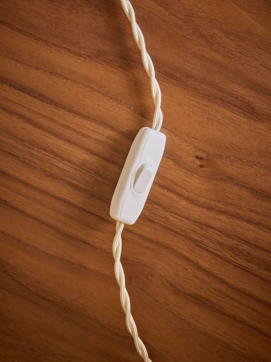 Câble torsadé 2 mètres avec interrupteur (coloris noir ou ivoire selon coloris). Ampoule non fournie (type culot à vis, LED E27 – 8W max.).