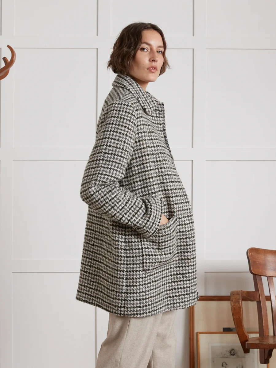 En version demi-saison, il laisse la grisaille sur le carreau. On aime sa juste coupe avec ses emmanchures montées et son lainage pied de coq de qualité italienne. Petit col arrondi, patte de boutonnage, 2 grandes poches plaquées devant Long. milieu dos 82 cm (en taille 38)
