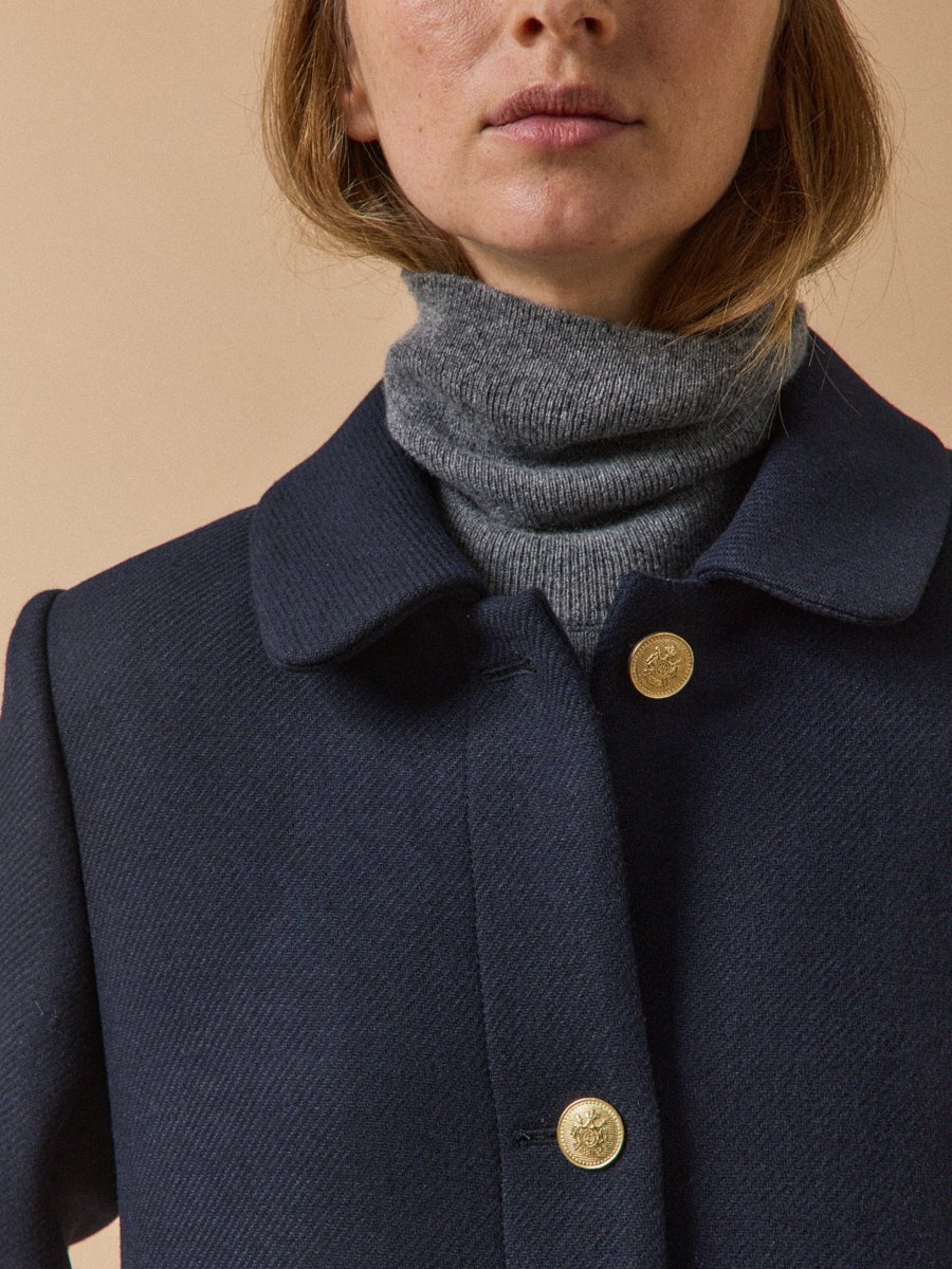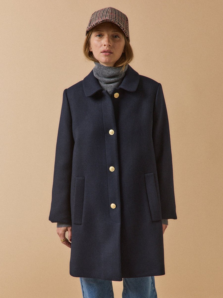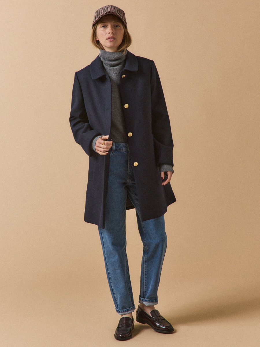 En version citadin chic, le manteau affirme son style avec un coloris intemporel, une ligne sobre modernisée de boutons métal doré et d’un très beau lainage armuré de la maison italienne Manteco. Une silhouette impeccable, un confort certifié bien chaud. Confection Europe.