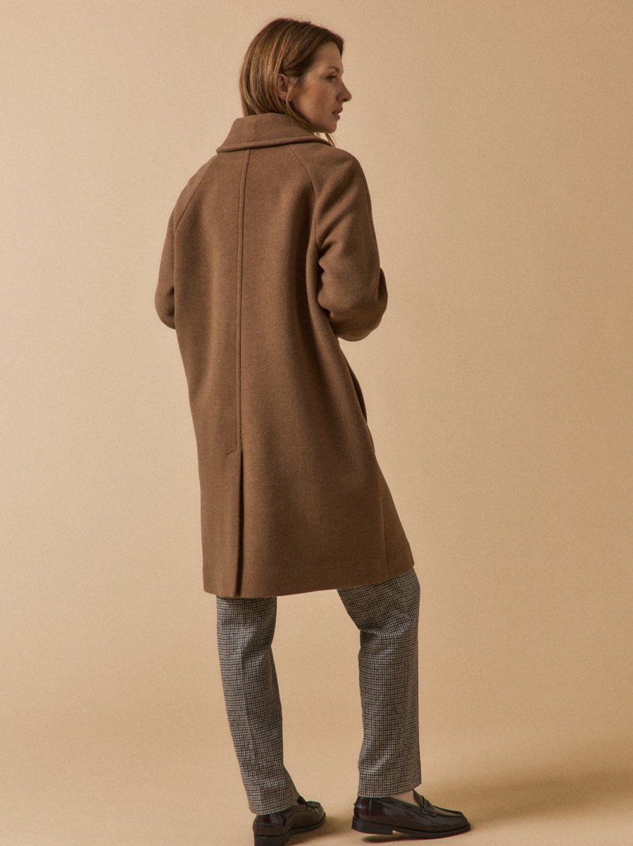 Lainage armuré chic et chaud. Volume droit avec emmanchures raglan. Tomber souple et coloris actuel. Élégant, féminin, confortable, le manteau galvanise le look urbain. Superbe tissu de la maison italienne Manteco.