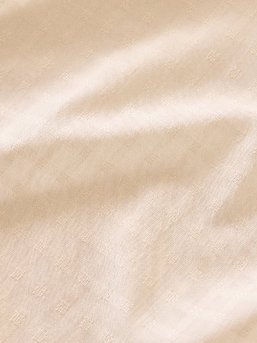 Il s’habille d’un jeu de carreaux texturés ton sur ton, créant un relief d’une élégance subtile. Le panneau en voile dobby offre une esthétique épurée qui préserve votre intimité tout en laissant une lumière douce et naturelle baigner la pièce.