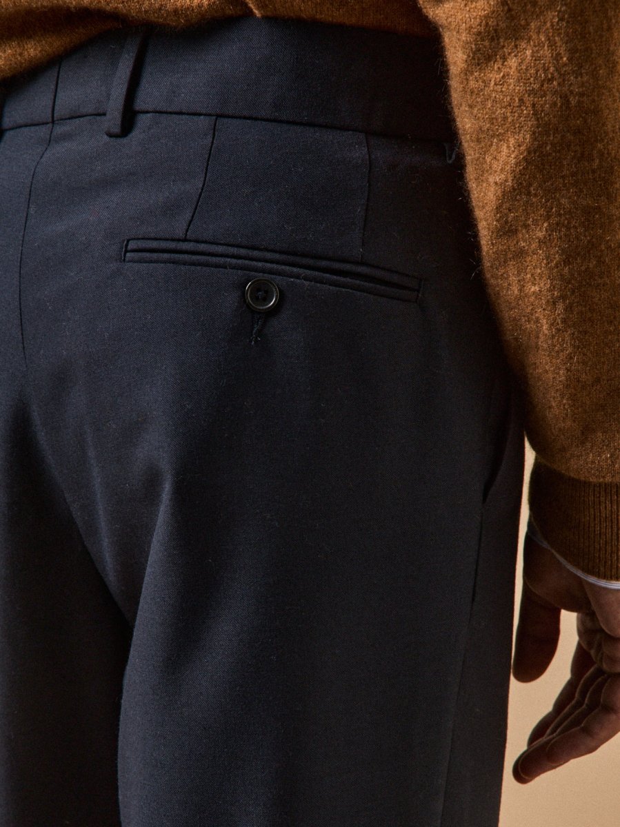- Plis creux et poches italiennes devant, pinces et poches passepoilées boutonnées dos