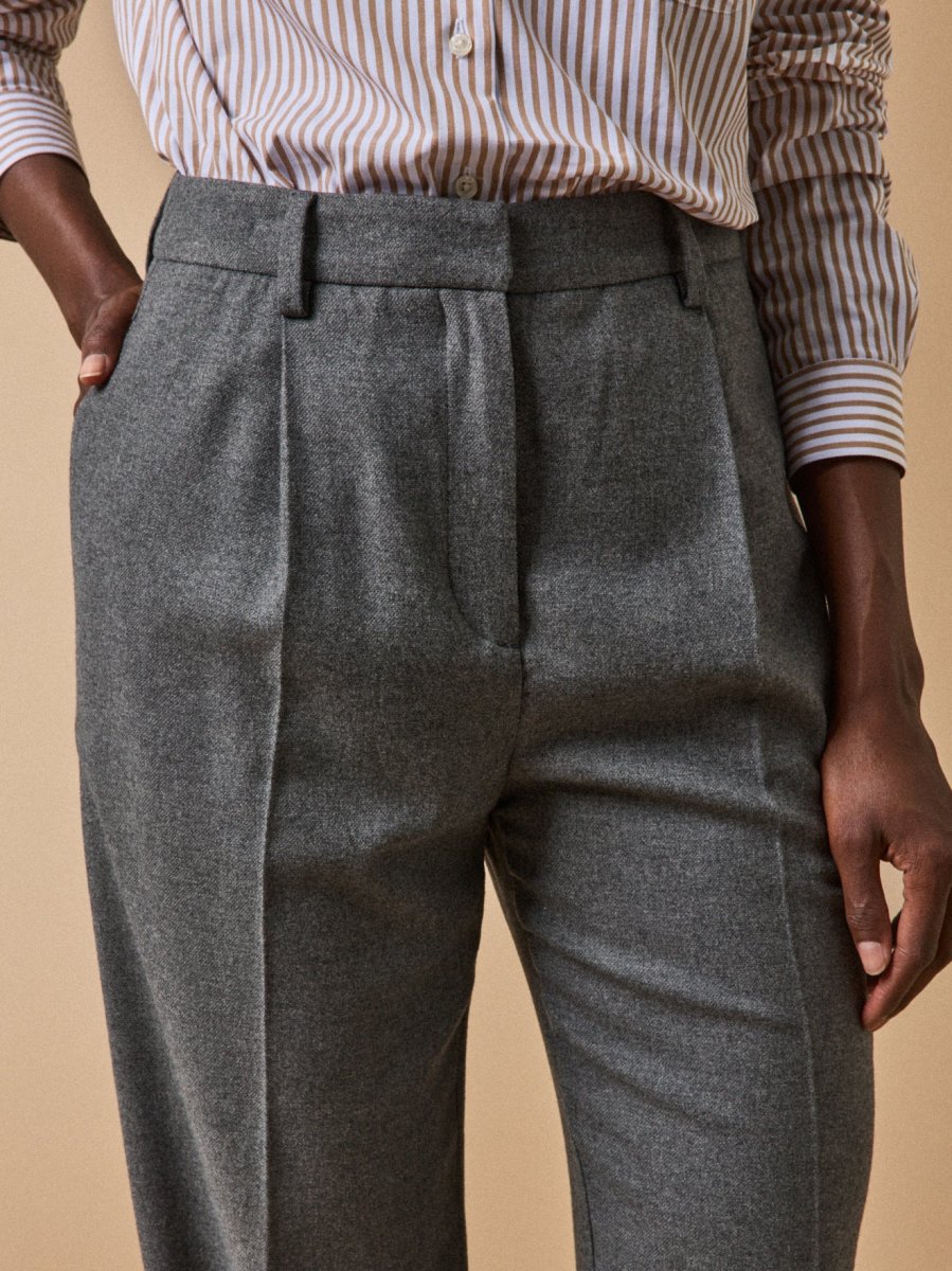 Il offre un look habillé et signe une silhouette moderne, féminine et raffinée. Toujours impeccable, le pantalon carotte affiche sa différence avec un superbe tissu flanelle de la maison italienne Manteco.