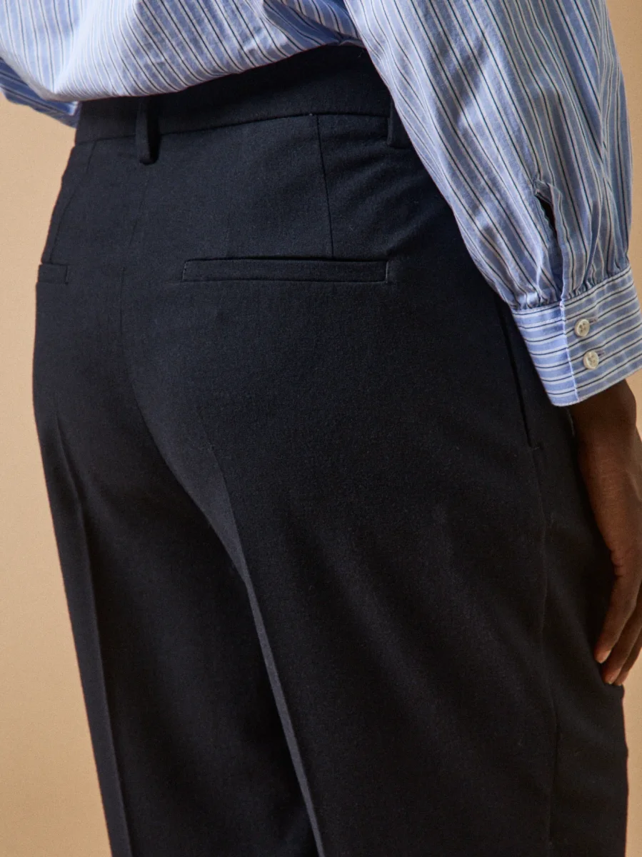 Il offre un look habillé et signe une silhouette moderne, féminine et raffinée. Toujours impeccable, le pantalon carotte affiche sa différence avec un superbe tissu flanelle de la maison italienne Manteco.