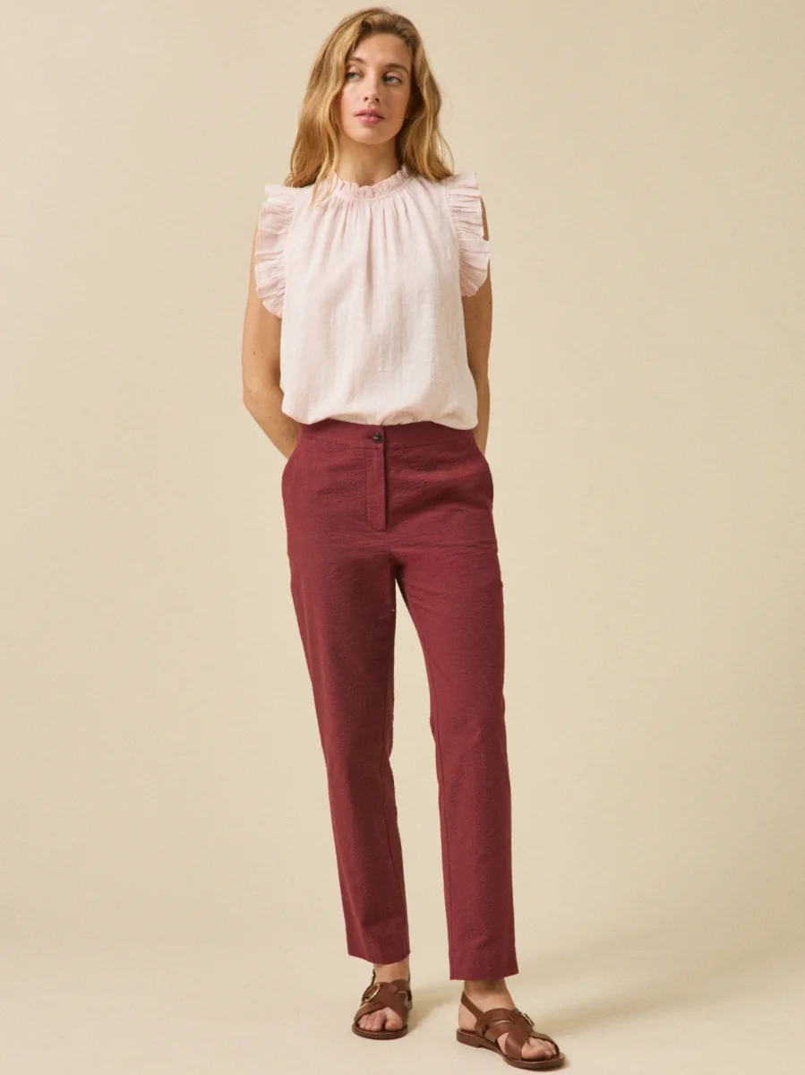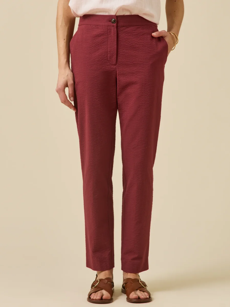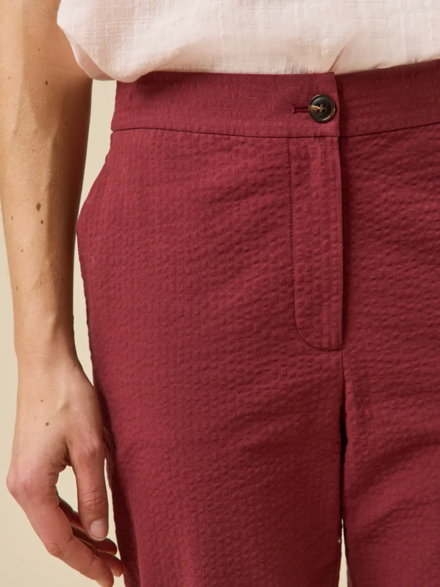 Sculpté dans un seersucker au relief gaufré emblématique, notre pantalon cigarette réinvente l’allure cool chic. Sa ceinture élastiquée au dos allie une aisance absolue à une silhouette impeccable, en faisant le complice idéal de votre vestiaire urbain.