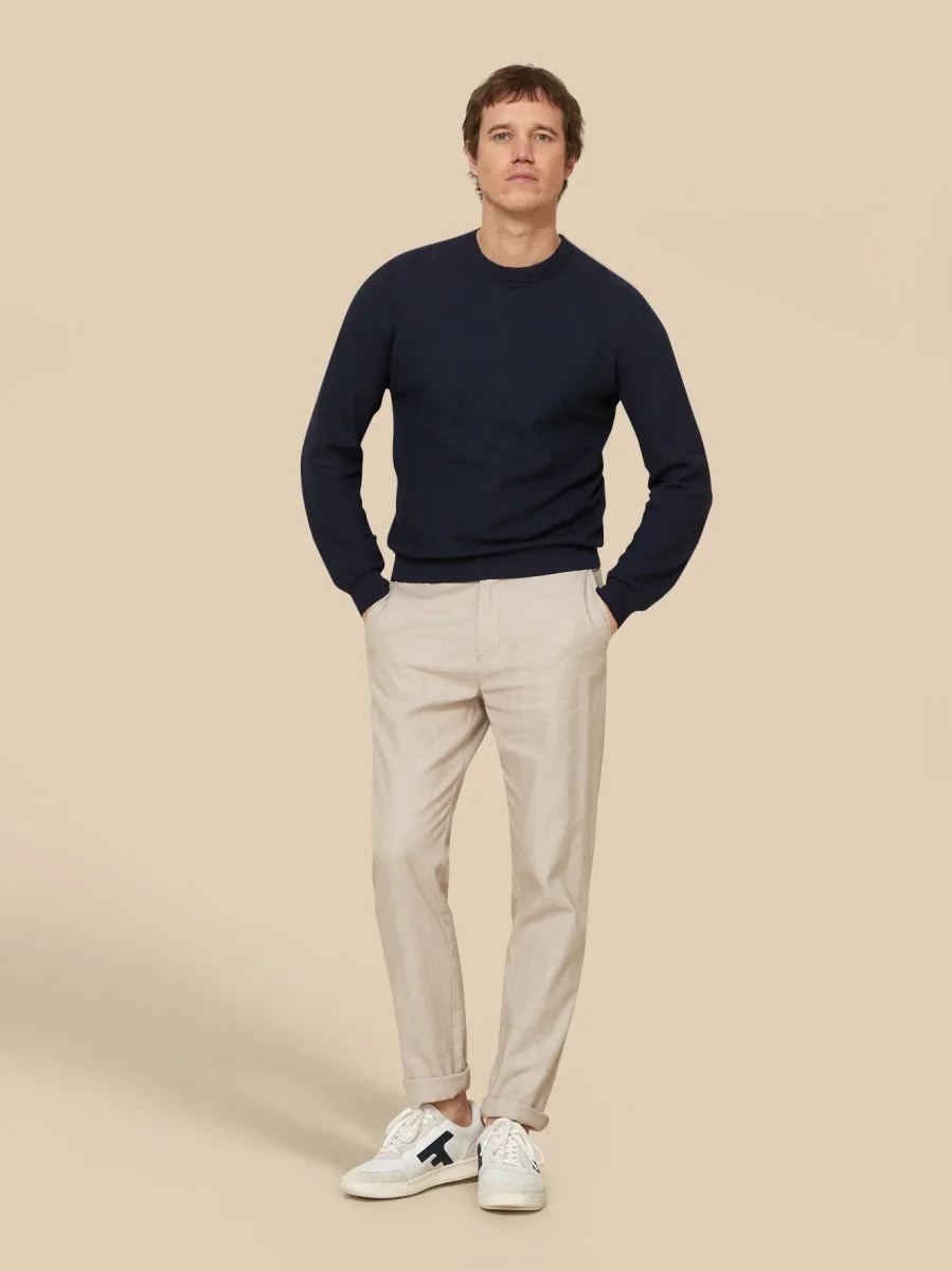Remarquable par son style et son confort, ce pantalon bénéficie d’une coupe décontractée mais travaillée : plus large au niveau des cuisses, ses jambes droites sont légèrement fittées et sa ceinture est élastiquée. Un volume actuel sur une belle matière stretch coton et lin. À porter avec ou sans revers.