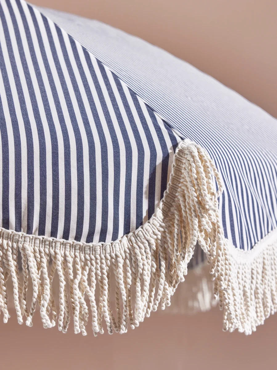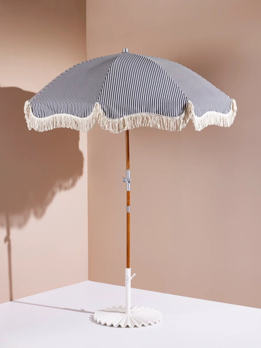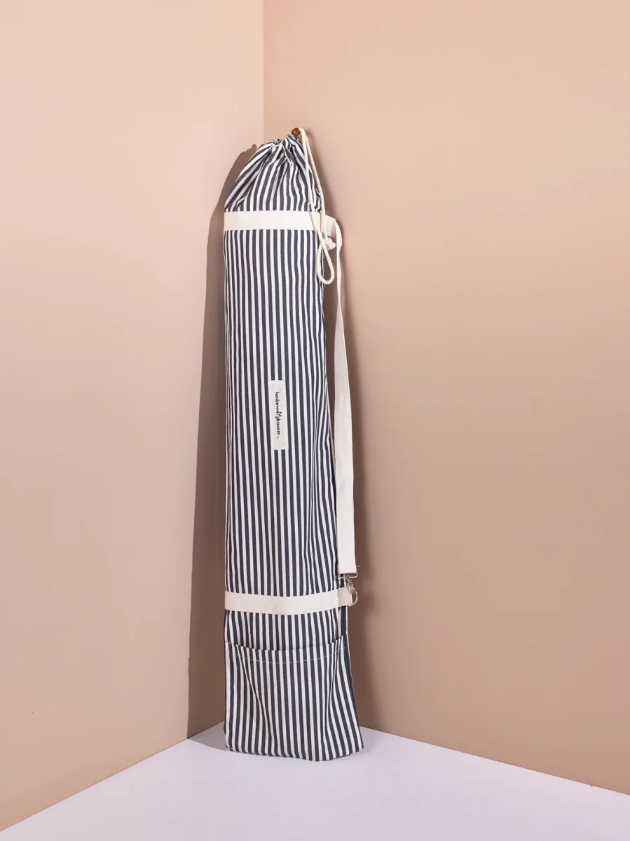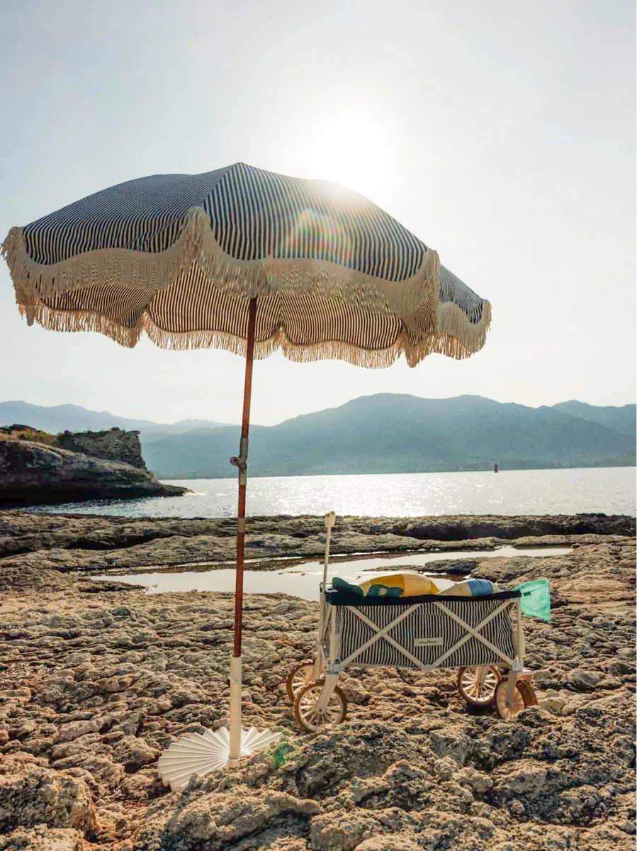Rayures navy intemporelles, design rétro chic et matériaux durables et de qualité : Business & Pleasure propose une collection haut de gamme d’essentiels pour la plage.Parasol rayé, inclinable et robuste. Grâce à son mât en bois et sa forme festonnée et frangée, il retrouve son allure authentique et son charme d’autrefois. Anti-UV, UPF 50+ (98 […]