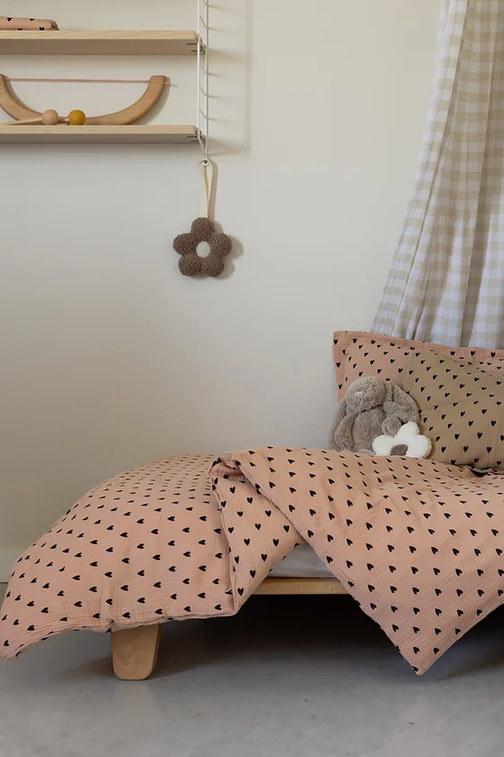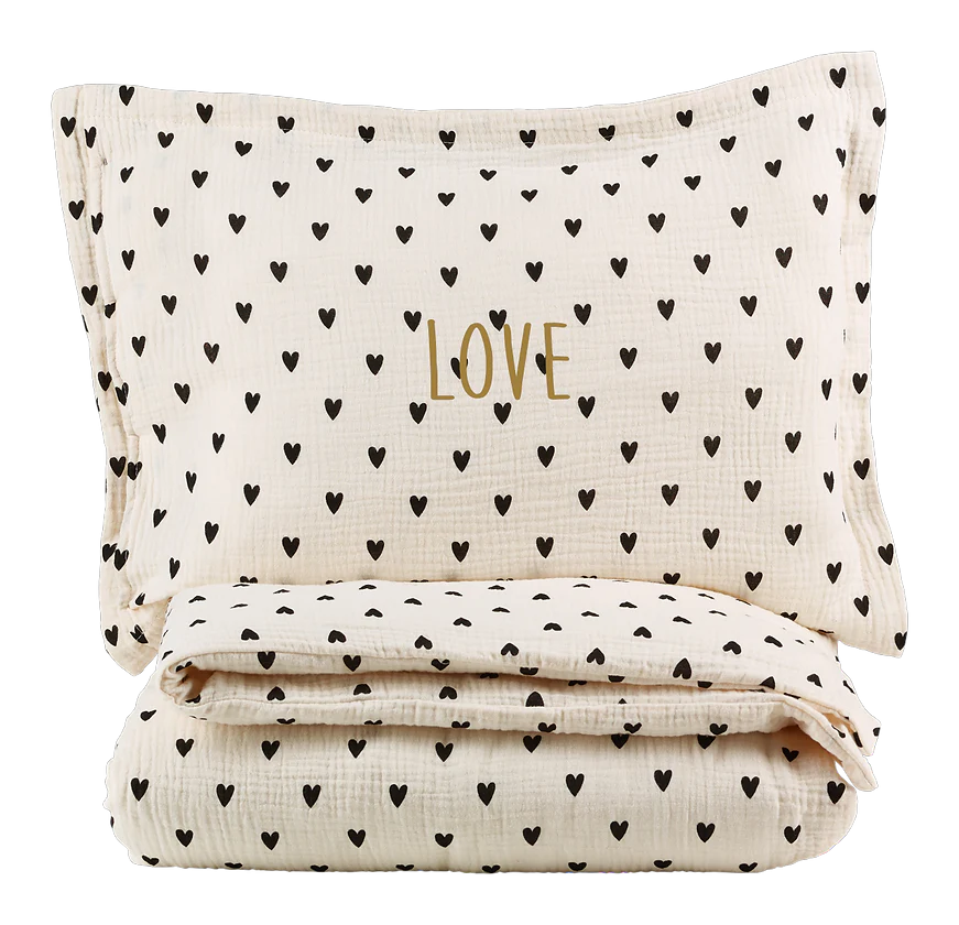 Parure de lit double gaze de coton rose avec impression coeur noir fabriqué au Portugal DIMENSIONS Housse de couette : largeur 140 x longueur 200 cm Taie d’oreiller : largeur 60 x longueur 40 cm Une personnalisation est possible sur la taie d’oreiller (m’envoyer un email après l’achat)