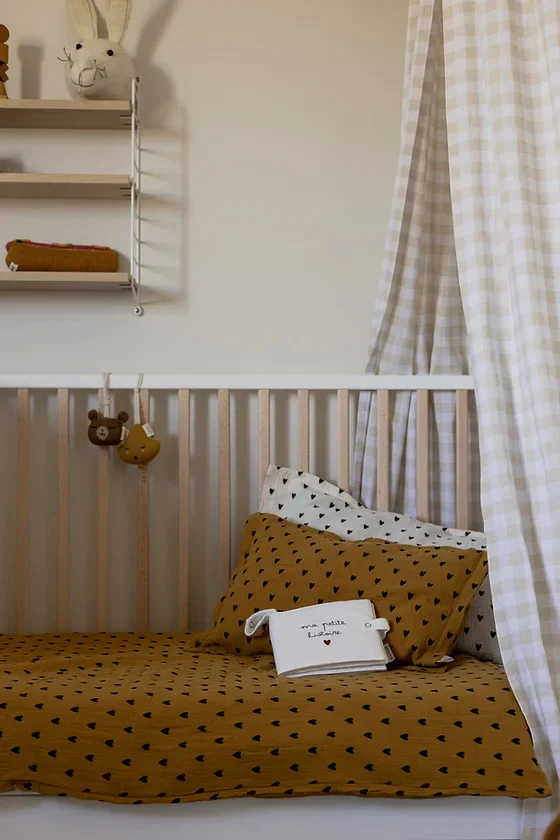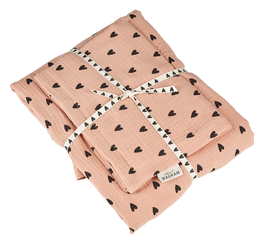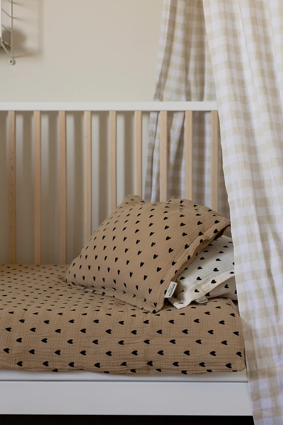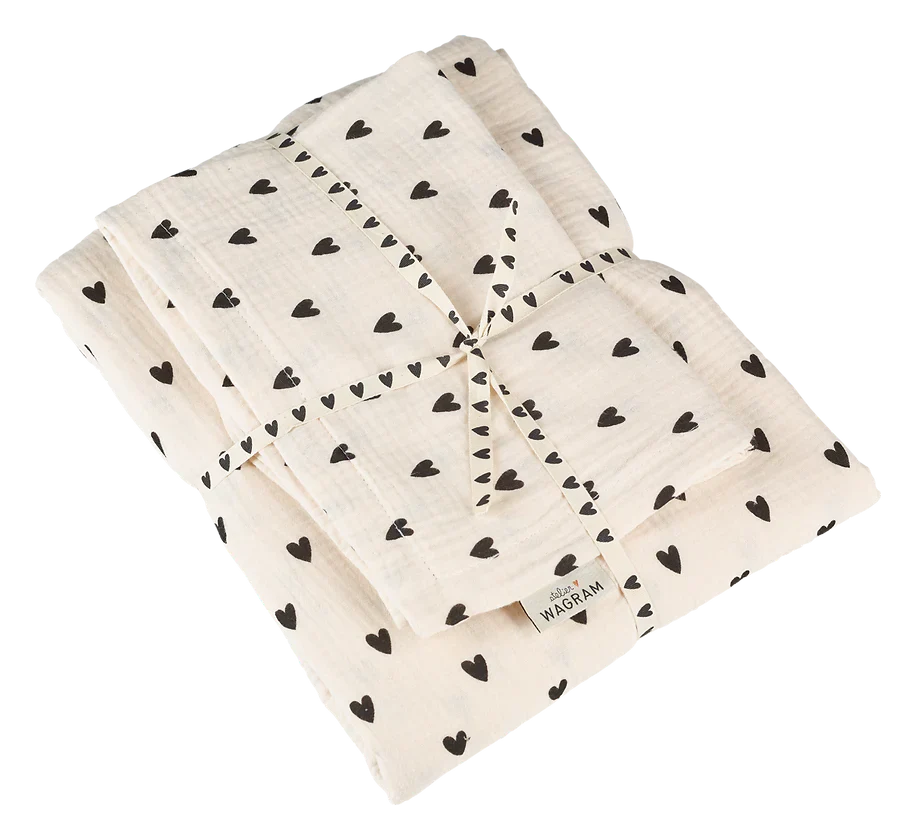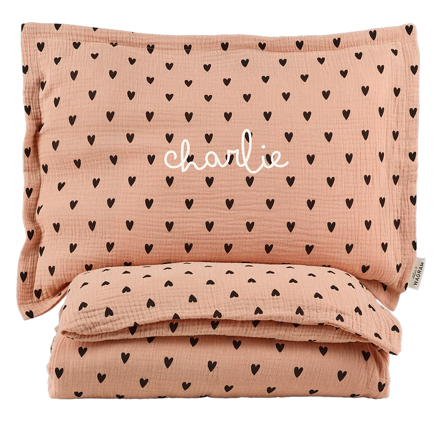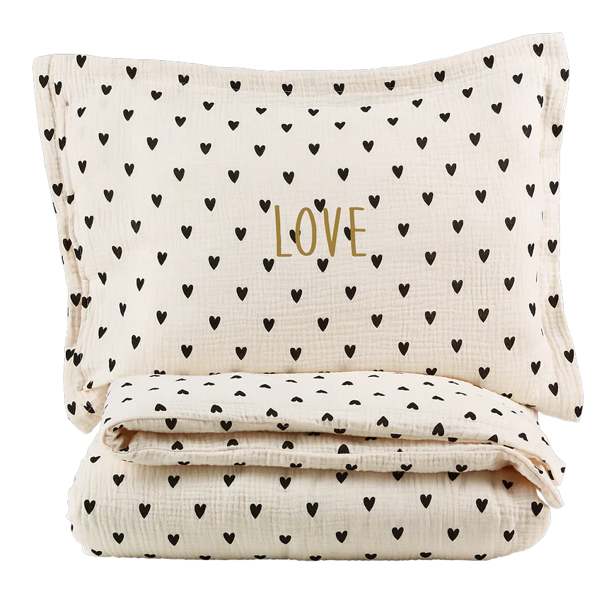 Parure de lit double gaze de coton écru avec impression coeur noir fabriqué au Portugal DIMENSIONS Housse de couette : largeur 80x longueur 120 cm Taie d’oreiller : largeur 45 x longueur 35 cm Une personnalisation est possible sur la taie d’oreiller