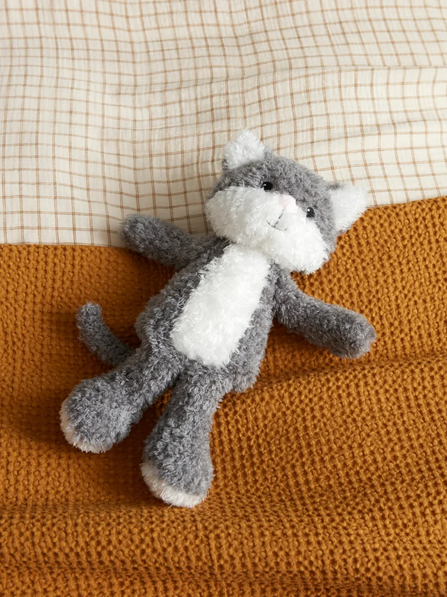 Peluche chat au pelage en bouclette coloris gris et blanc. Sa petite frimousse est délicatement brodée. Un doudou tout doux et tout moelleux.