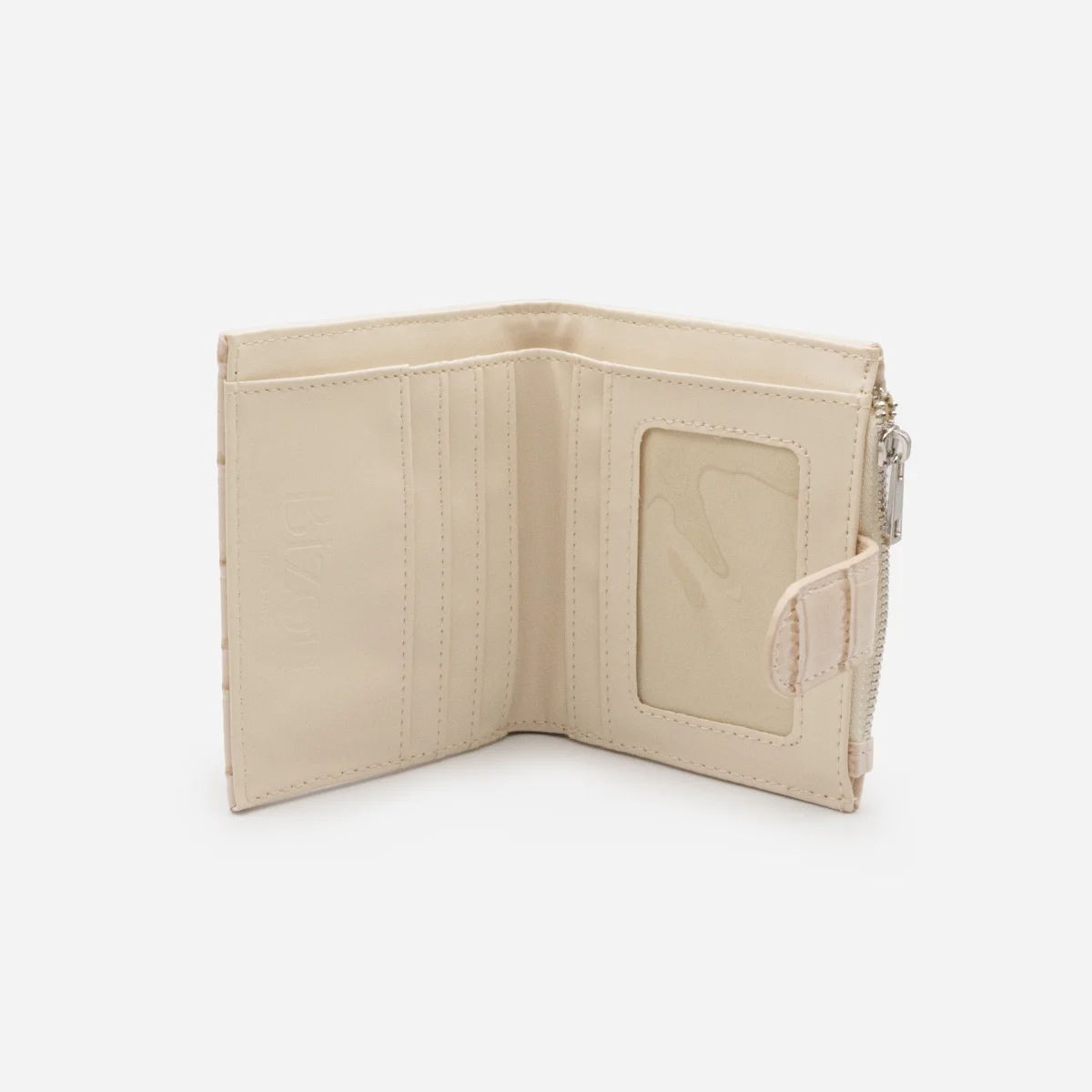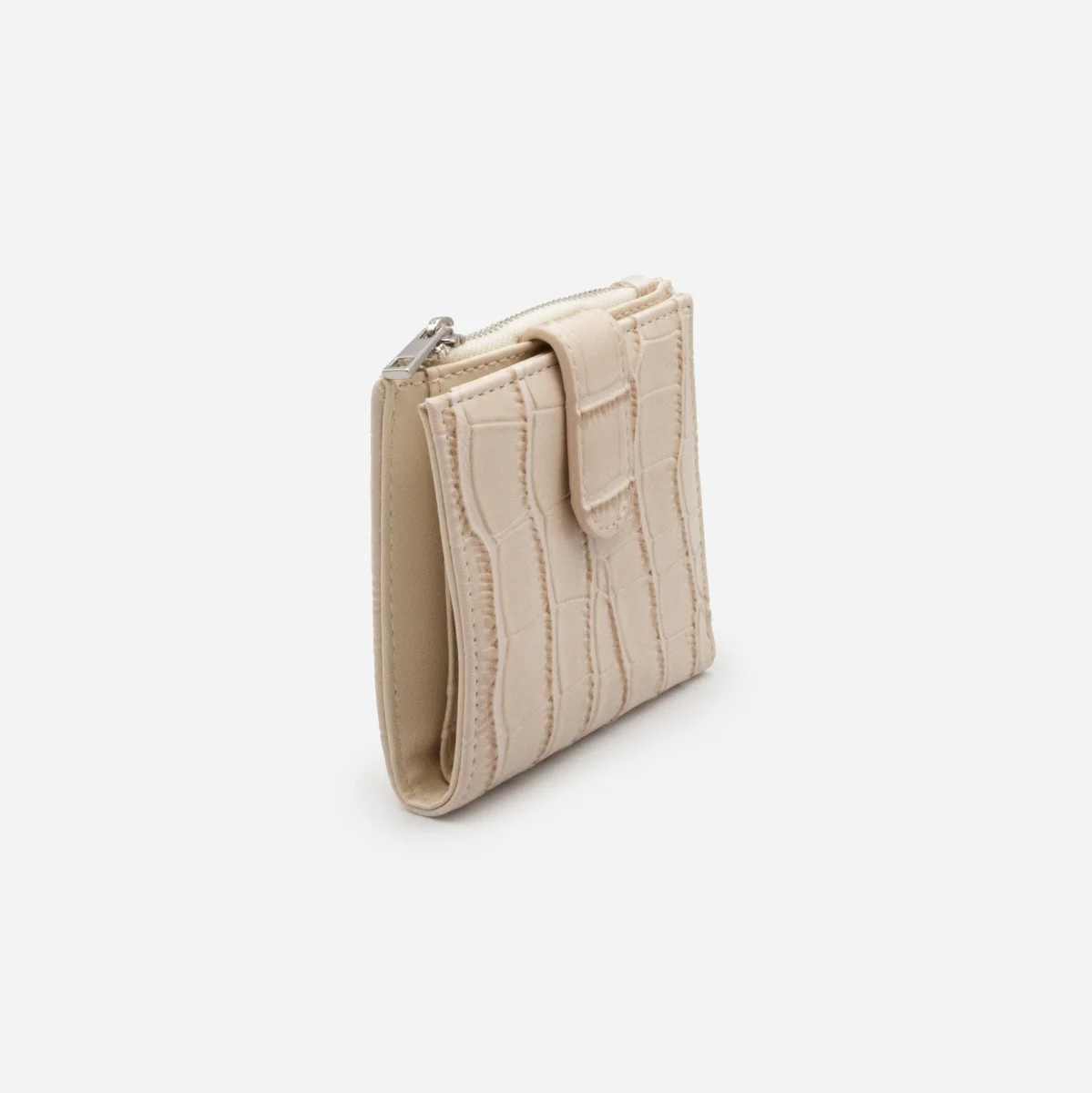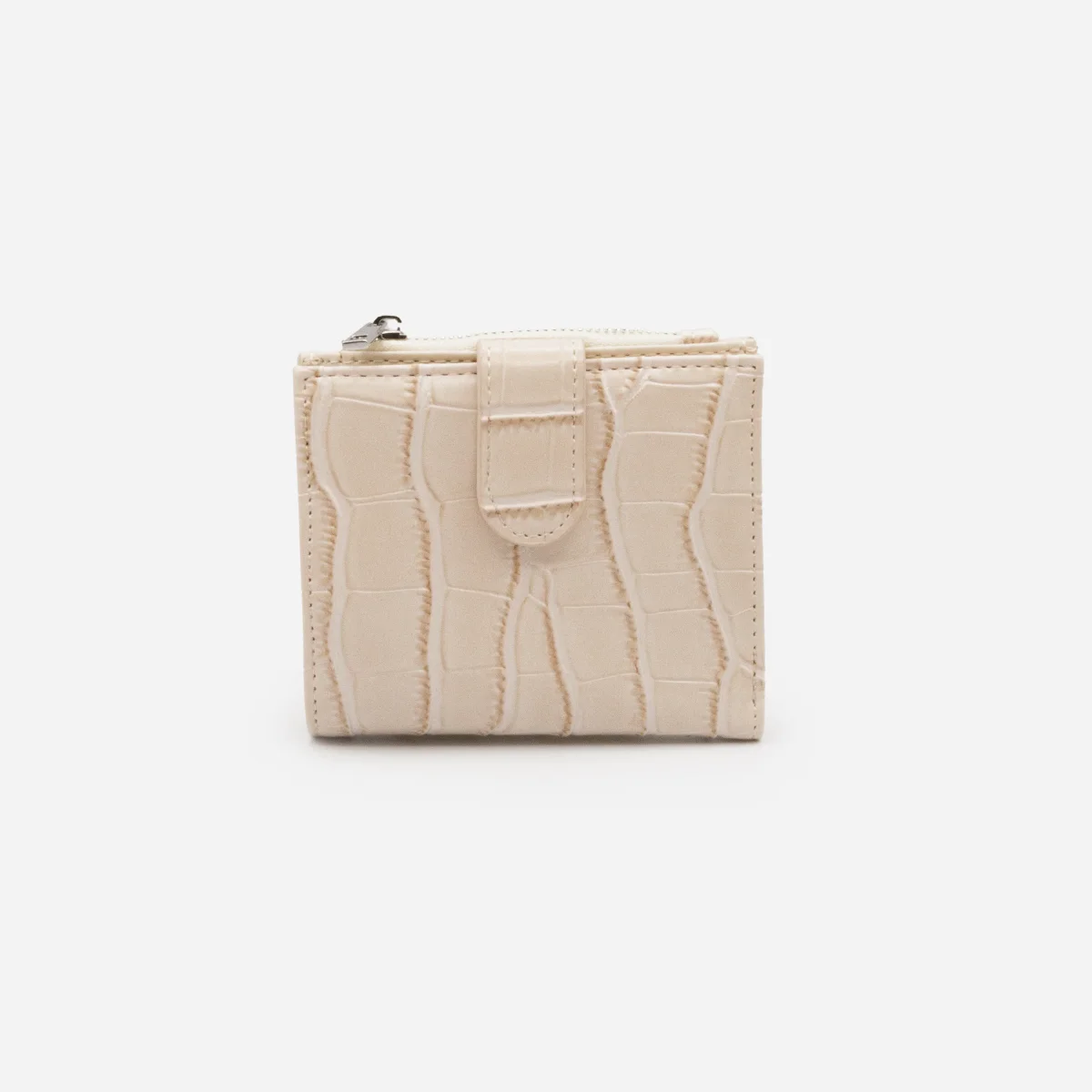 Ravissant, ce petit portefeuille ivoire à rabat imitant la peau du crocodile te permet de ranger tout le nécessaire (billets, cartes et monnaie) sans t’encombrer!