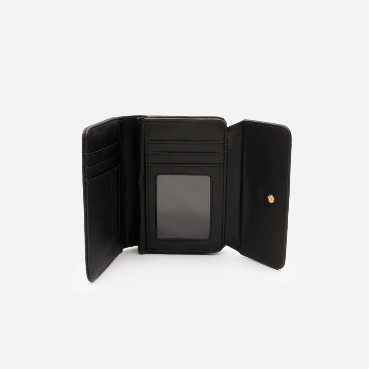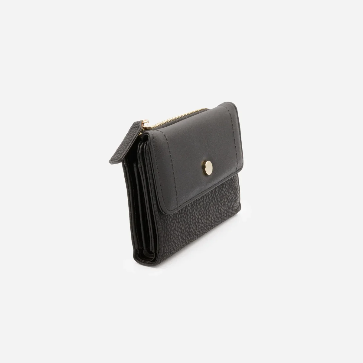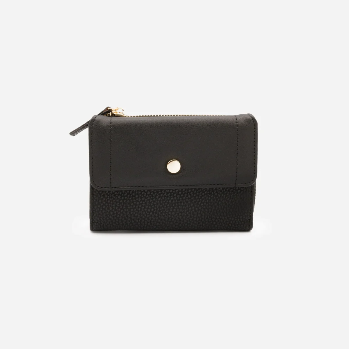 Avec sa surface tantôt lisse, tantôt bosselée, ce petit portefeuille noir à bouton doré dispose de tout ce dont tu as besoin en terme de style, mais aussi en terme de rangement: une pochette à fermeture éclair, des fentes pour y glisser tes cartes et des espaces destinés à tes billets de banque!