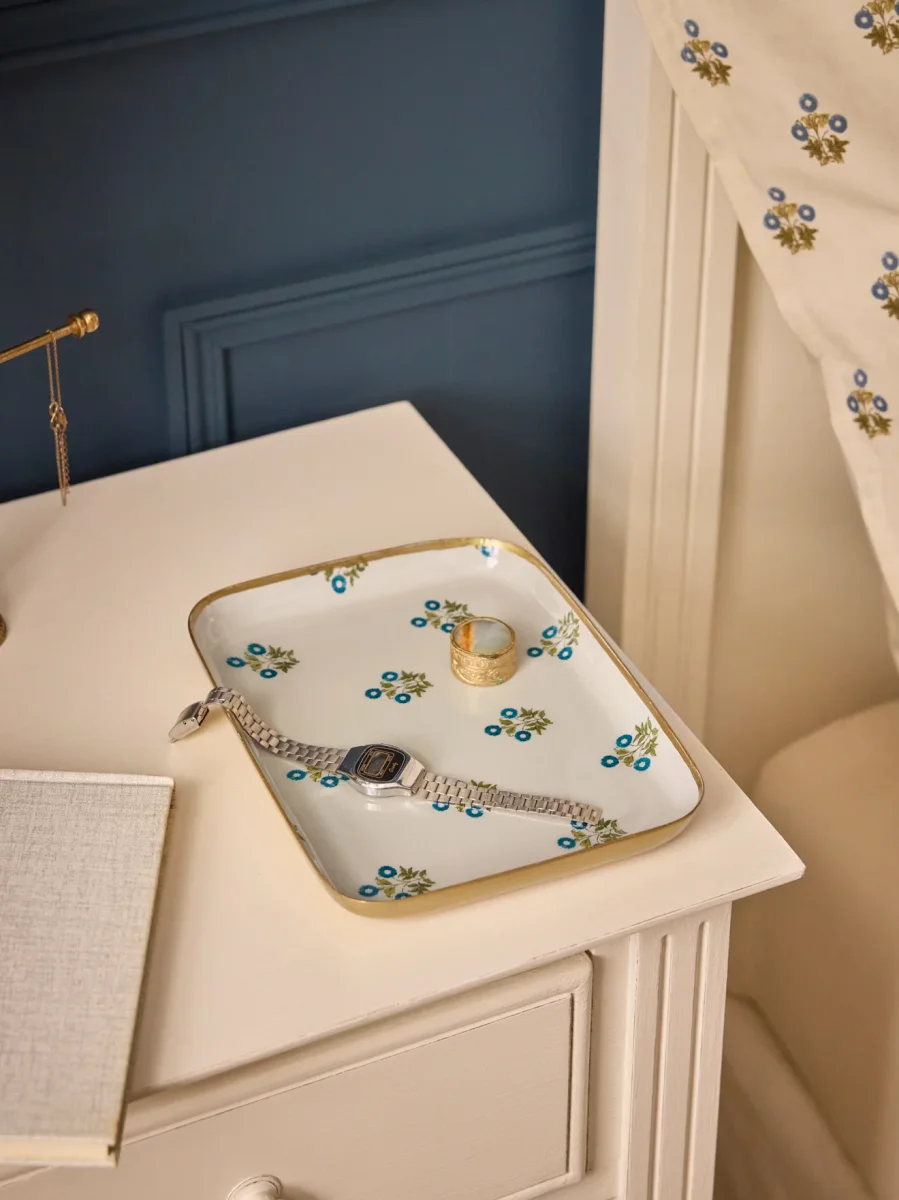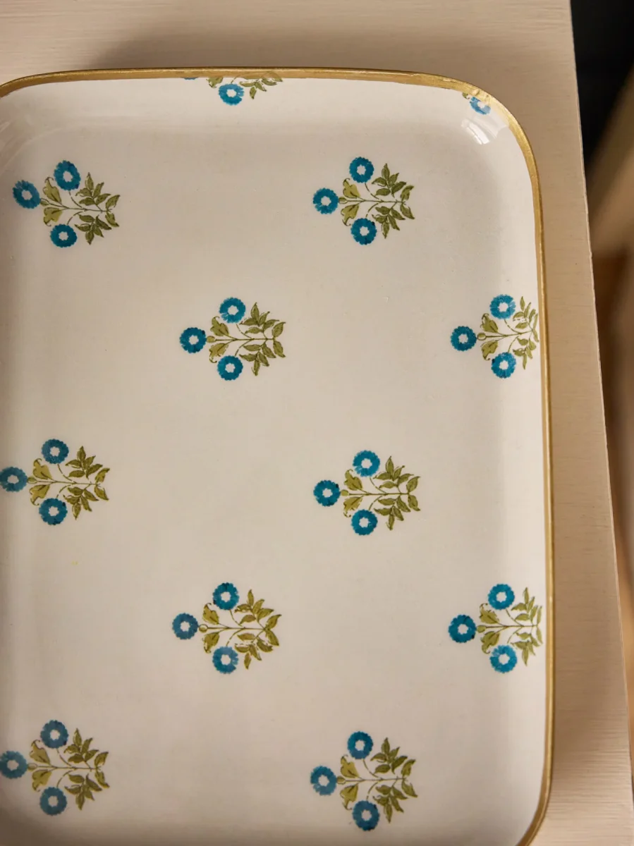 Plateau rectangulaire en aluminium émaillé. L’imprimé Ashley est un dessin exclusif réalisé par nos stylistes. Ce plateau est issu de l’artisanat indien. Chaque pièce est unique et réalisée à la main. L.20 x H.2 x l.15 cm env.