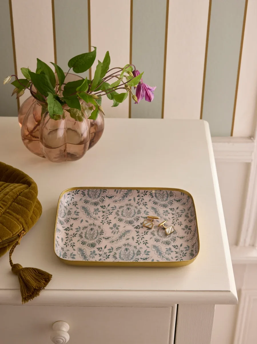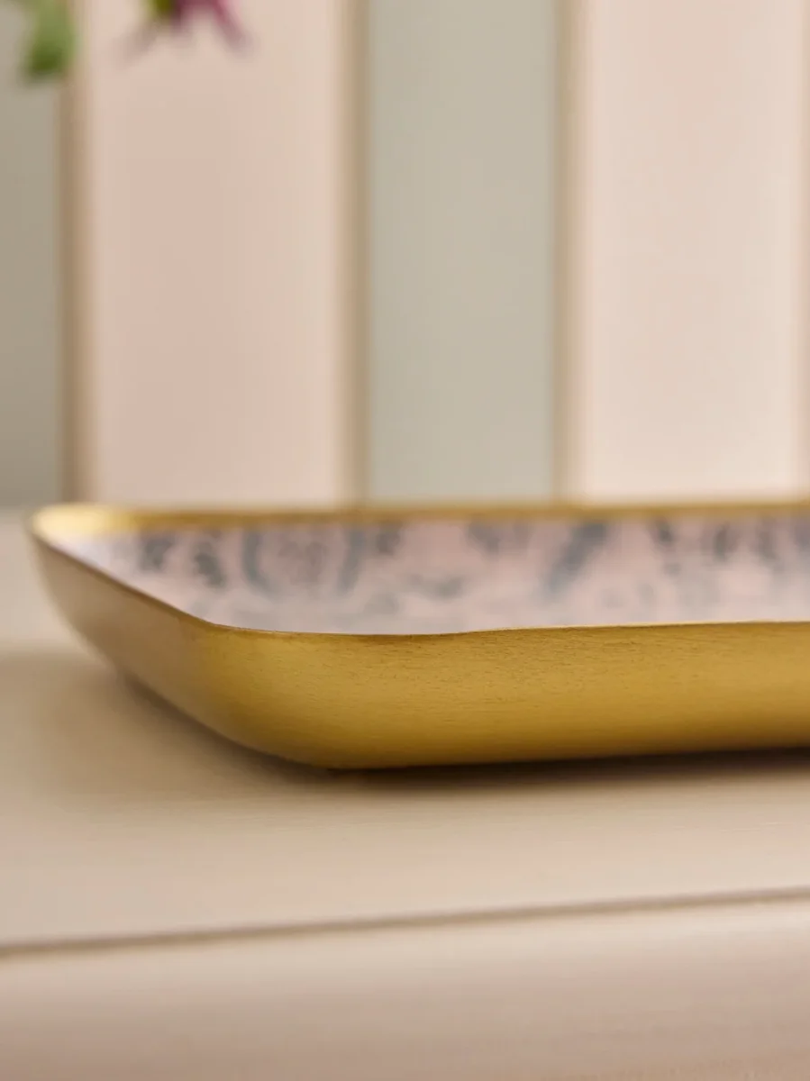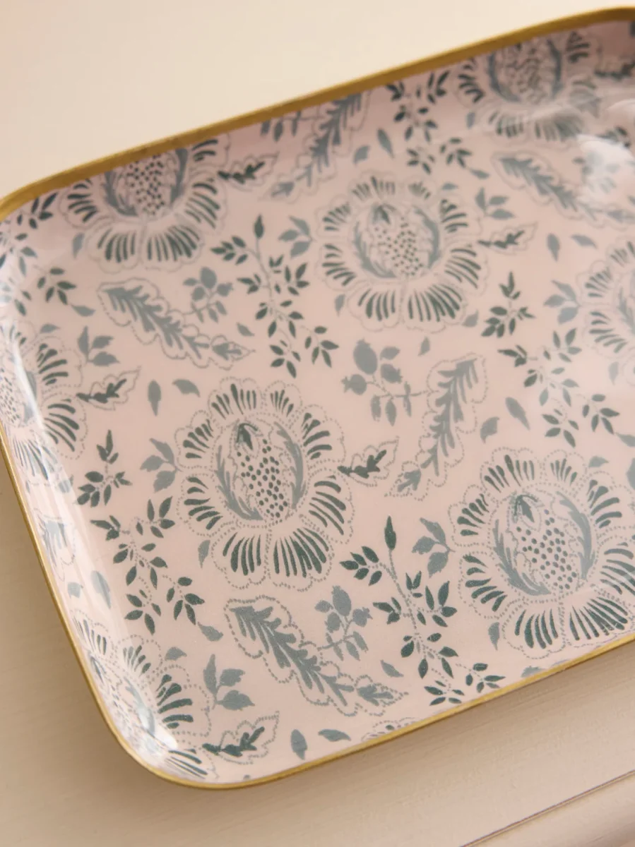 Plateau rectangulaire en aluminium émaillé. L’imprimé Géraldine est un dessin exclusif réalisé par nos stylistes. Ce plateau est issu de l’artisanat indien. Chaque pièce est unique et réalisée à la main. L.20 x H.2 x l.15 cm env.