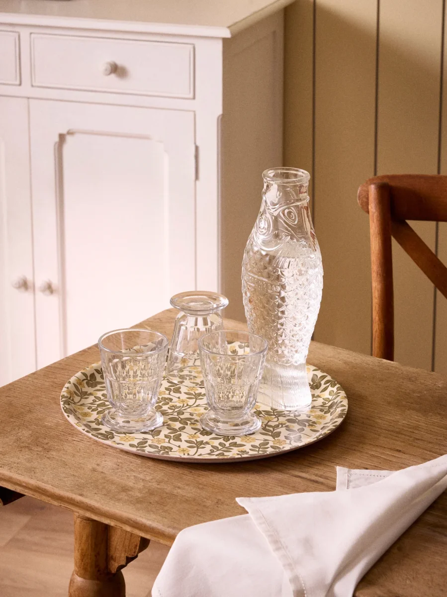 Plateau rond en bois de hêtre massif, tapissé de papier imprimé puis recouvert d’une fine pellicule de protection mate et incolore. Ce motif floral est une exclusivité Cyrillus. Plateau fabriqué en Europe. Diamètre 35 cm. Épaisseur 2 cm env.