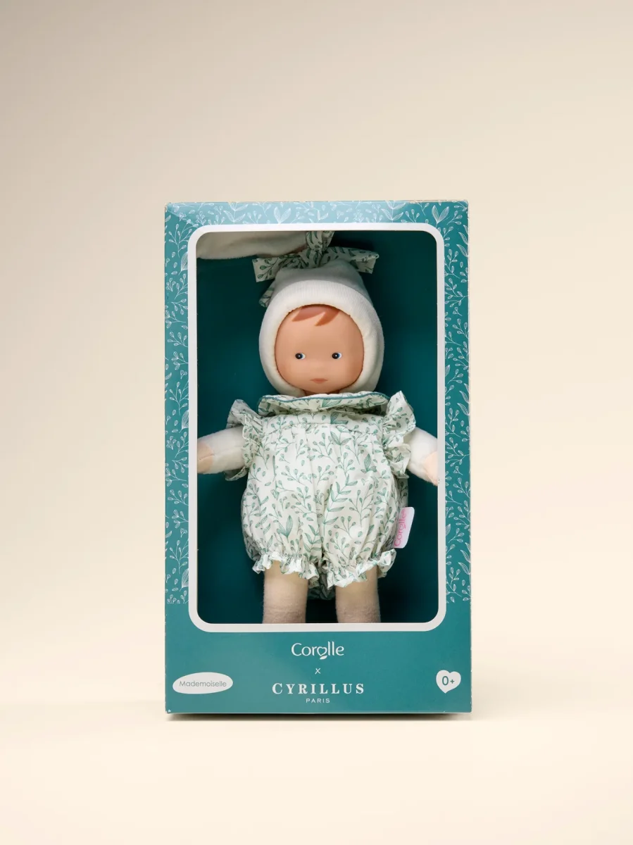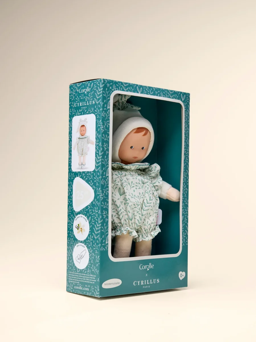 Mademoiselle Corolle est une poupée-doudou née de l’union de deux grandes marques emblématiques françaises. Deux marques qui partagent le goût du beau et du bien fait : Corolle qui berce depuis des décennies des générations d’enfants avec ses adorables poupées à la senteur de vanille et Cyrillus qui habillent des familles entières et particulièrement les enfants depuis près de 50 ans avec ses collections élégantes et de grande qualité.