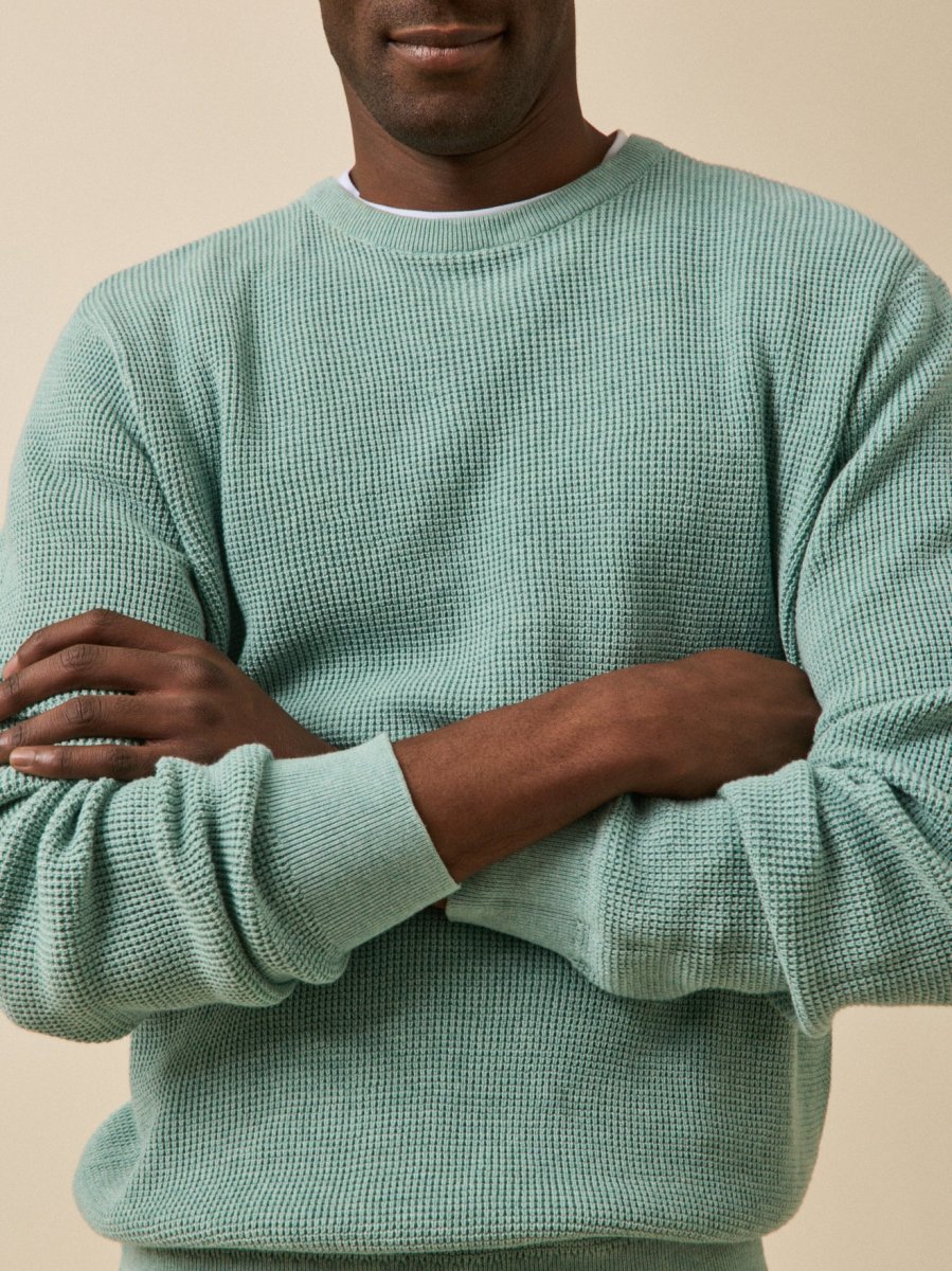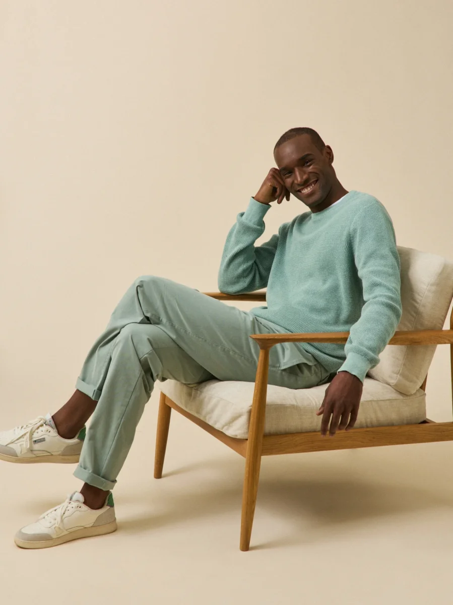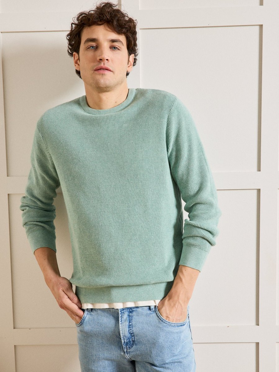 Classe sur un jean ou un chino, cool sur un bermuda, le pull ras-de-cou s’offre un coloris dans l’air du temps et une belle maille gaufrée en coton léger. Une pièce idéale pour la mi-saison.