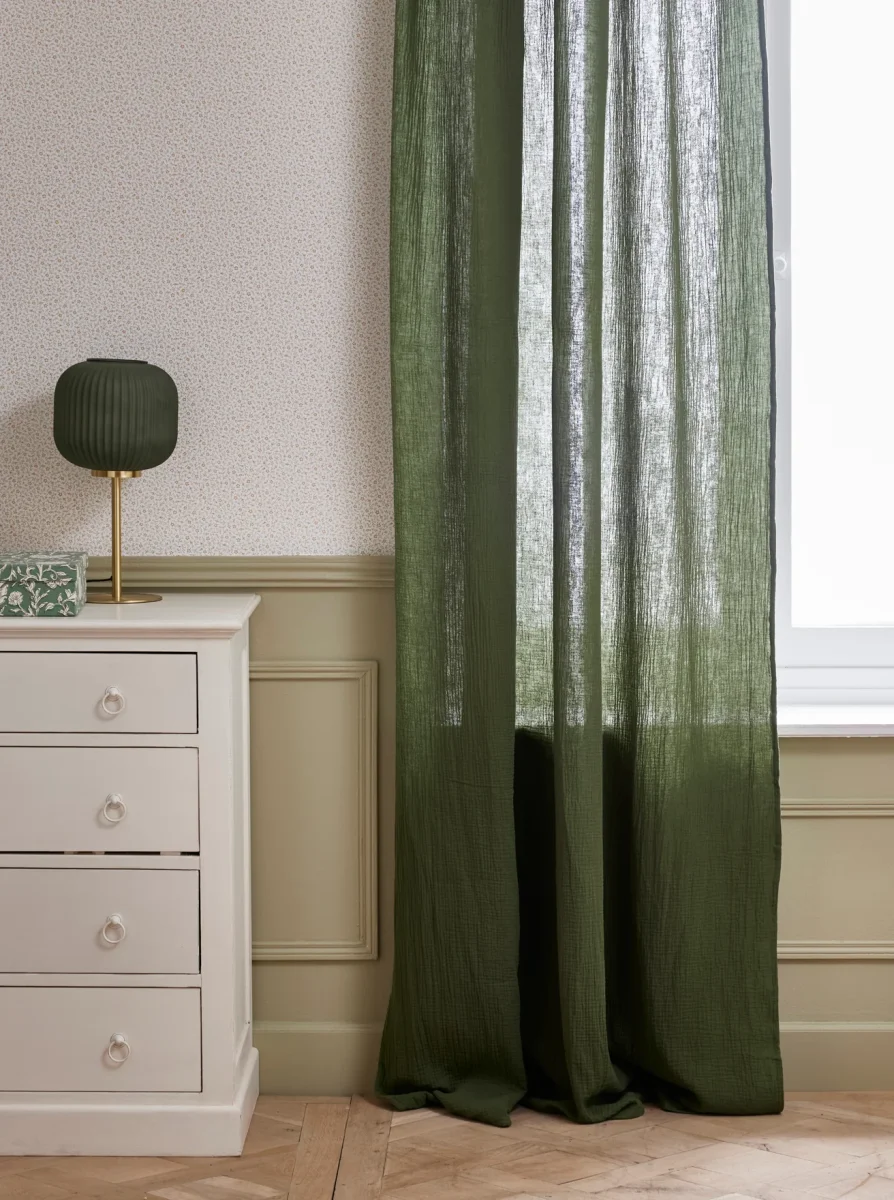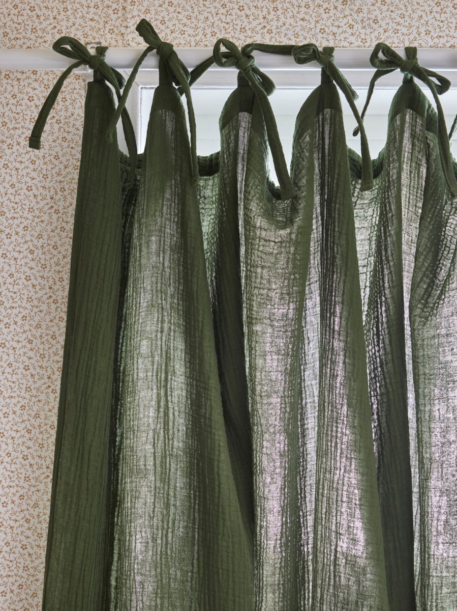 Rideau à l’aspect gaufré confectionné en gaze de coton et maintenu par de petites nouettes.