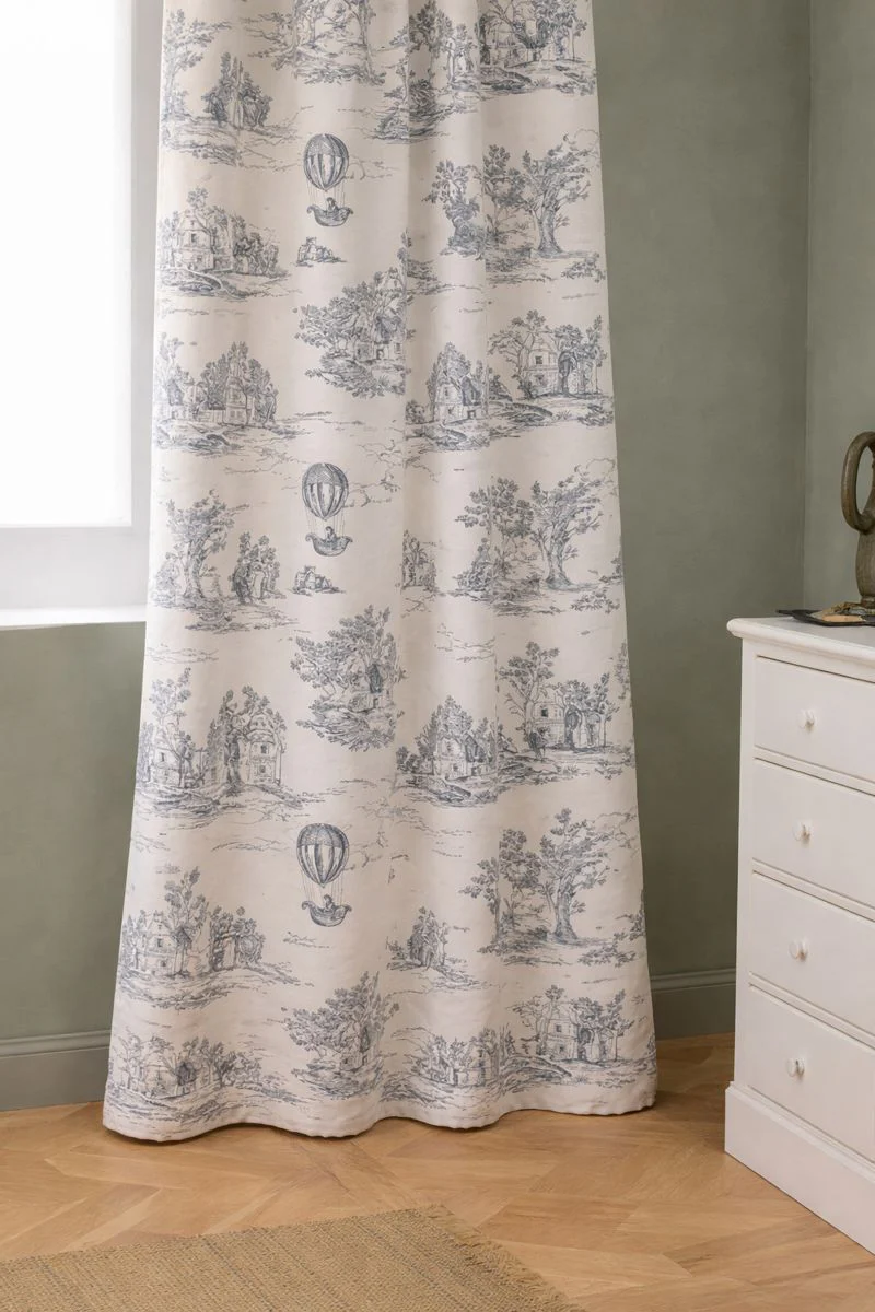 Nous avons choisi de nous inspirer de l’esprit toile de Jouy pour réaliser ce rideau à oeillets en coton épais. Un style quasi authentique au charme chic et intemporel.