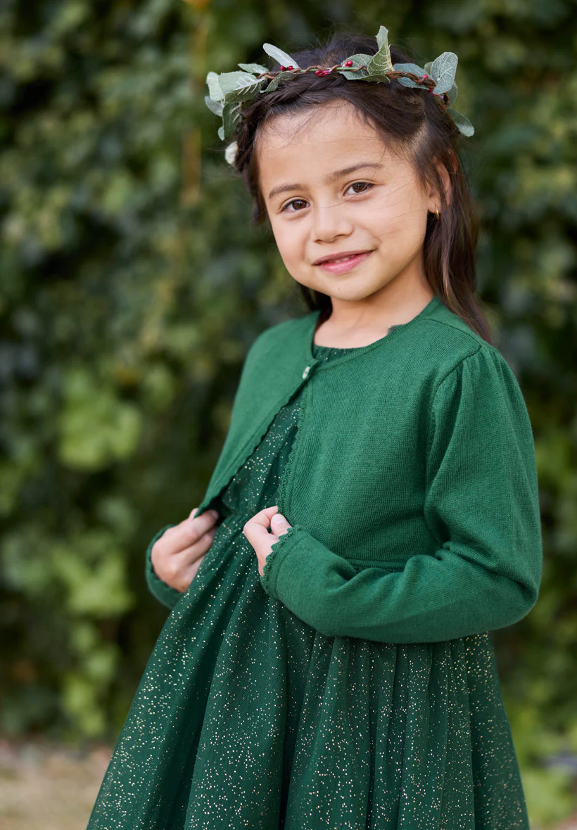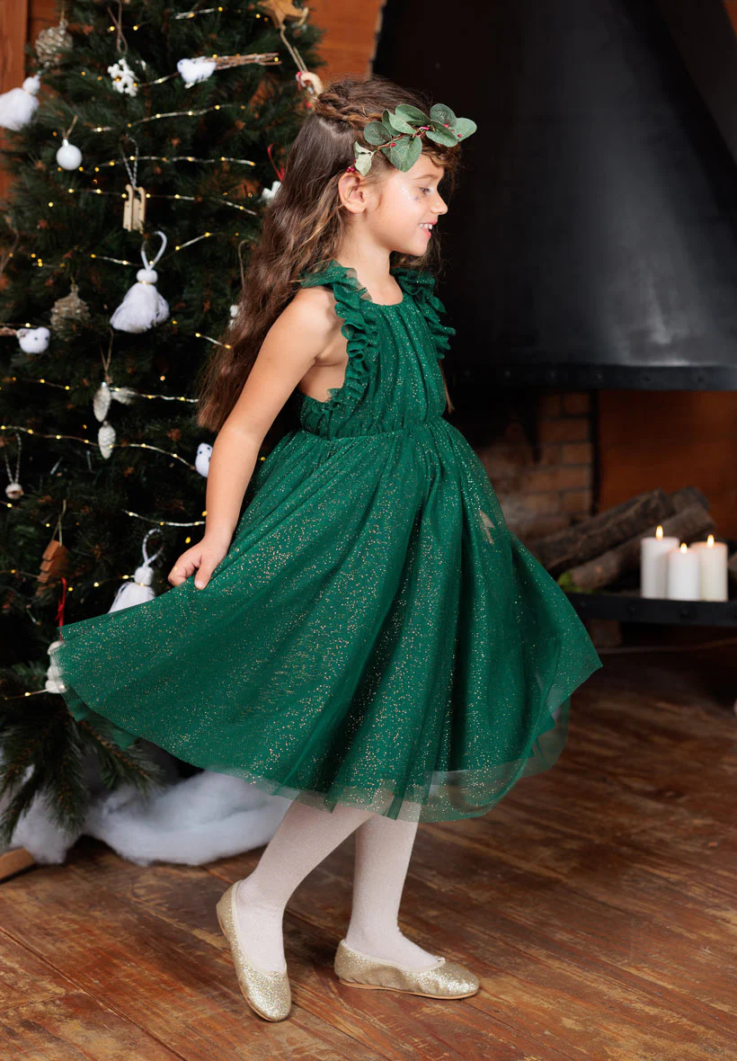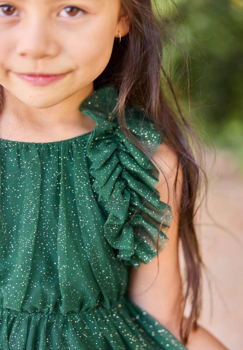 Avec son buste aux paillettes dorées et sa jolie jupe en tulle doublée de coton, la robe de fête Scarlett Bleu nuit est un incontournable pour les princesses d’hiver. Cette pièce romantique et très couture fera rêver petites et grandes filles, d’autant que oui, ELLE TOURNE ! Et elle tourne tellement que les petites filles s’en donneront le tournis… ça aussi on vous le garantit 😉 ! Avec son joli dos en forme de V et ses bretelles habillées de volants en tulle tout doux, romantisme, et style résolument délicat seront au rendez-vous pour cette jolie robe de fêtes.